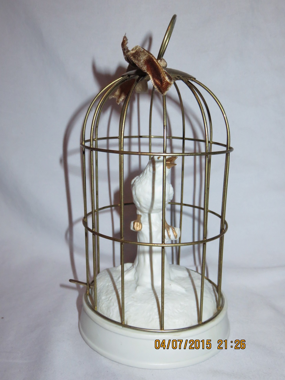 Porcelain bird and base, metal case. |