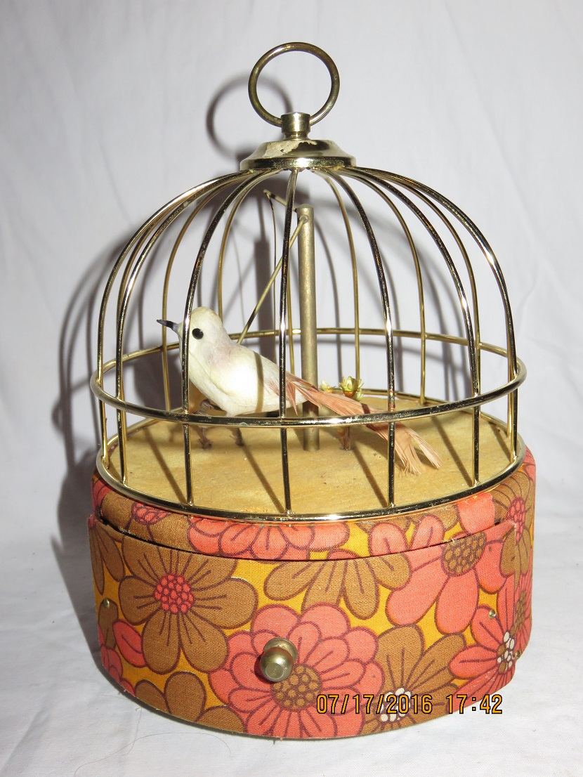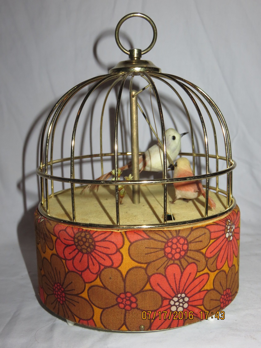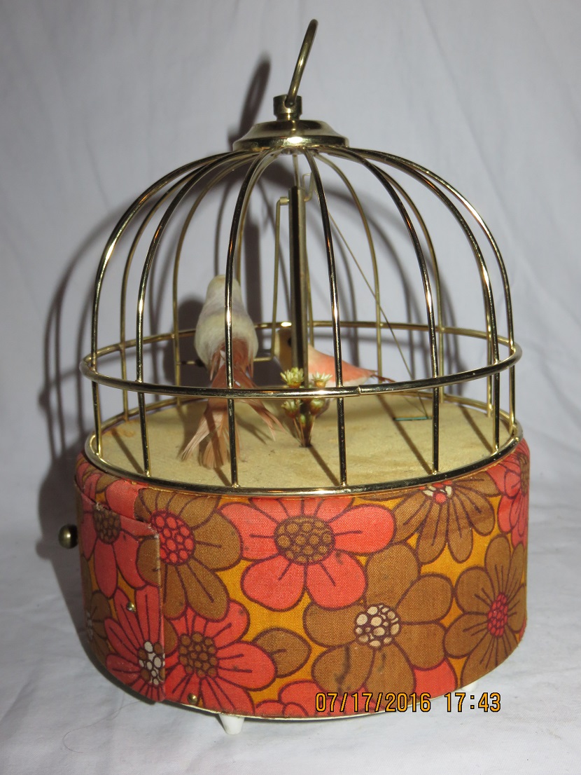 White bird with brown tail feathers on swing goes forward/backward when music plays. |