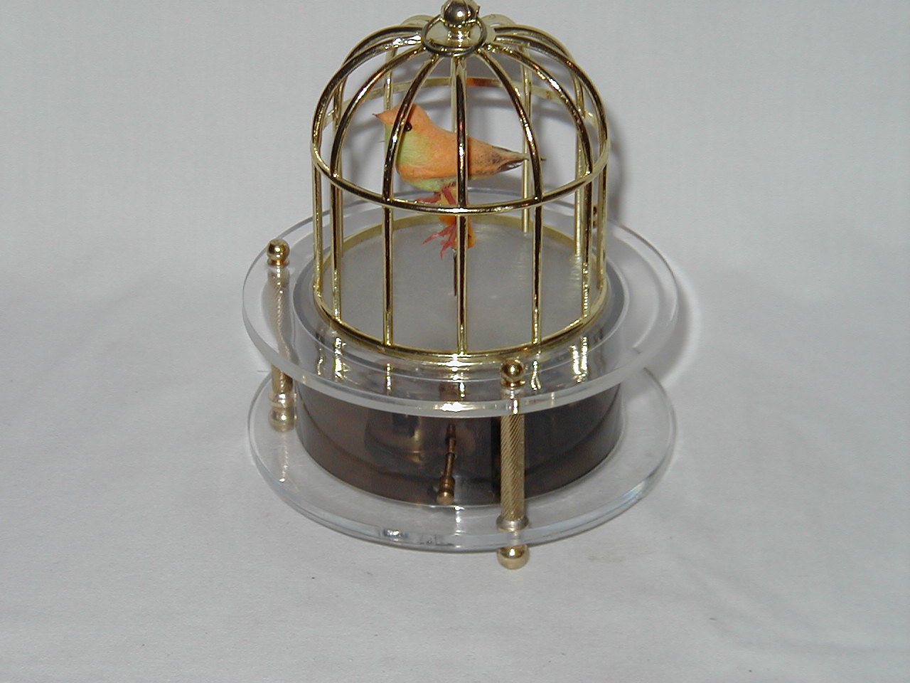 Yellow Bird in Small Cage Rotating on Pedestal