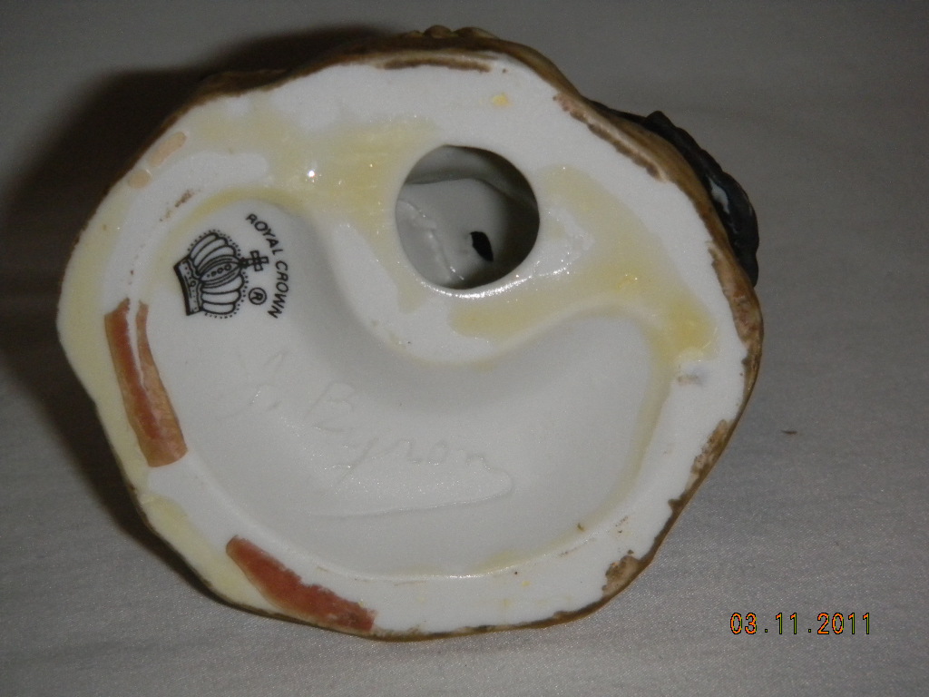 Toucan figure glued to base and came off; that enabled to see ' Royal Crown ' (+crown image) to show, as well as inscripted ' J Byron ' signature (see photo # 6). Figure reglued to base. |