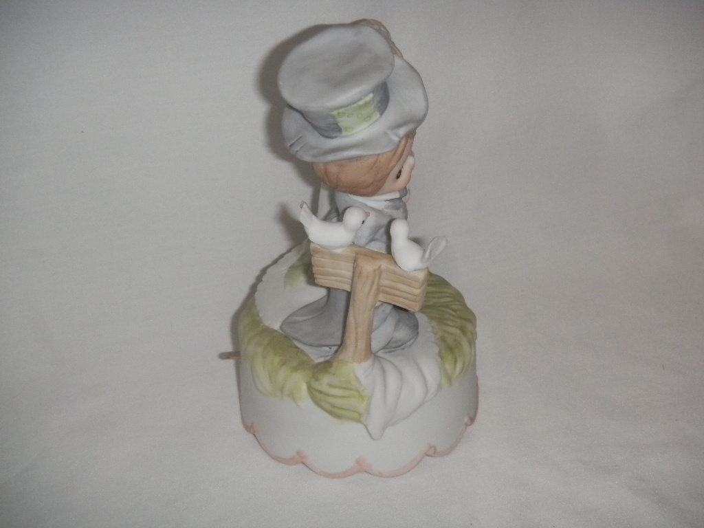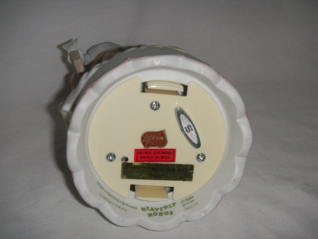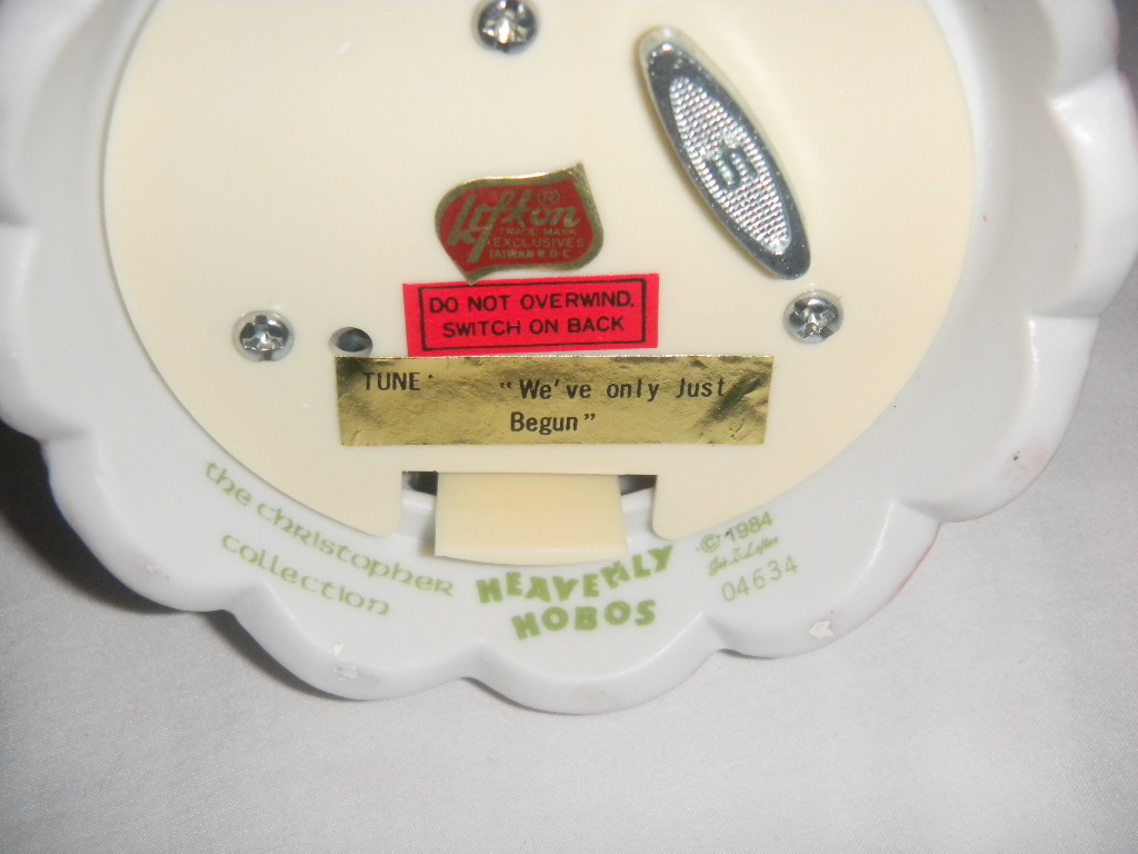 In the Collection there are actually 3 look-a-like figurines from Lefton, but with differences in description, bottom cover and tunes. See A 006 014 and A 114 038. Also this one ( A 006 031 ) seems to be slightly smaller and lighter. This item mentions on the inside bottom rim ' Heavenly Hobo's ', that neither of the other 2 do. Although these could be 3 variations of the same theme, all mentioning 1984, I wonder whether one or two of them are actually genuine Lefton or not.