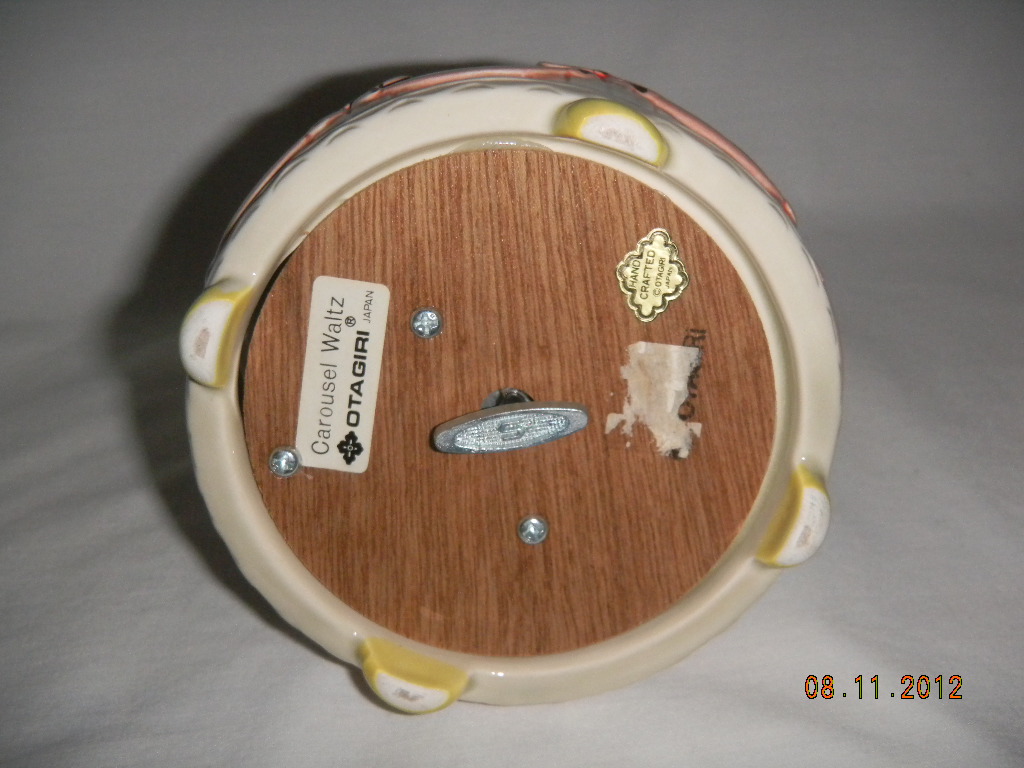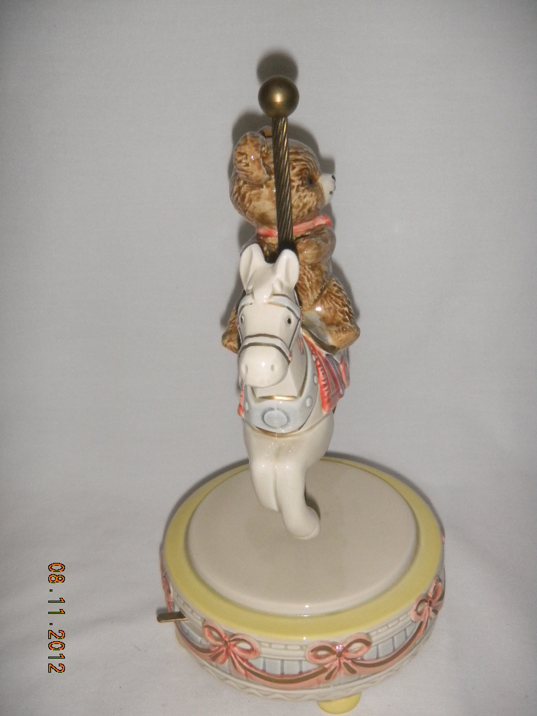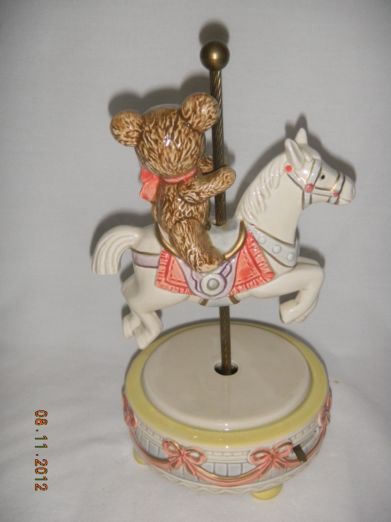 Carousel horse with bear rotates on gilded pole with music playing. |