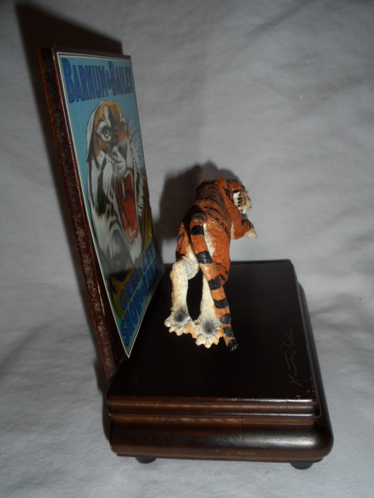 Also mentioned : ' 8784 '. On stand: ' Barnum & Bailey Greatest Show on Earth '. Signature on top stand: K..... Titol ? Original sales label ' $46.65 '. Tiger fixed in place, not moving. |