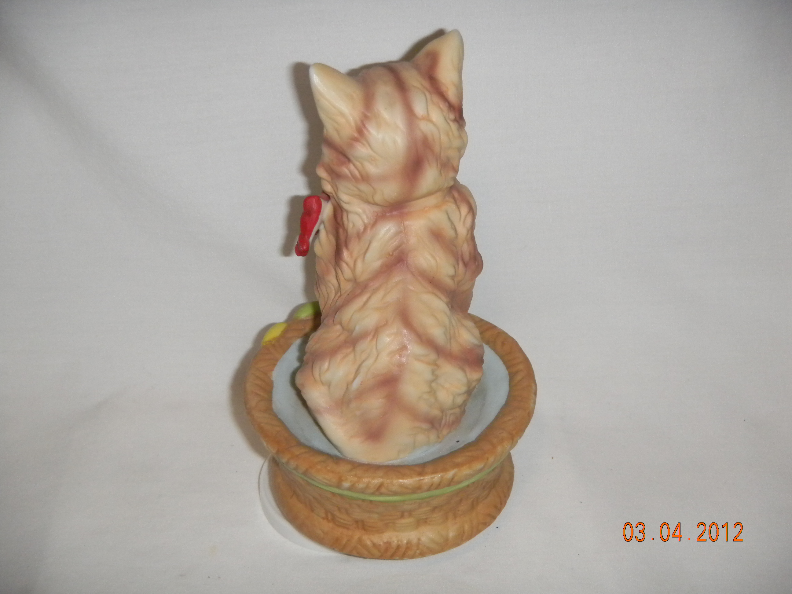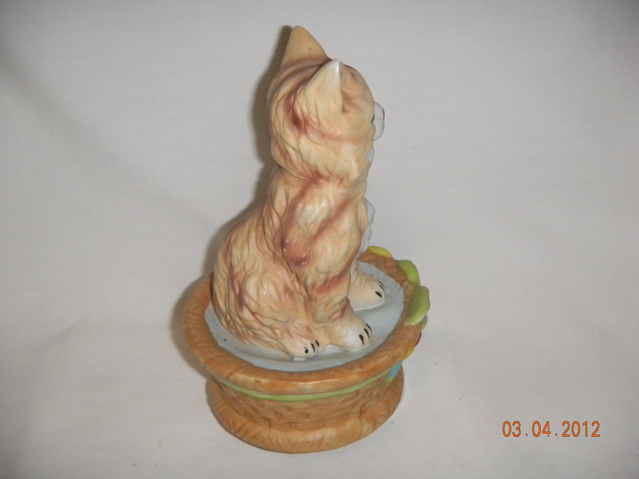 Stoneware cat, porcelain base?, wood cover bottom. |