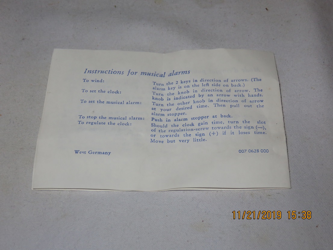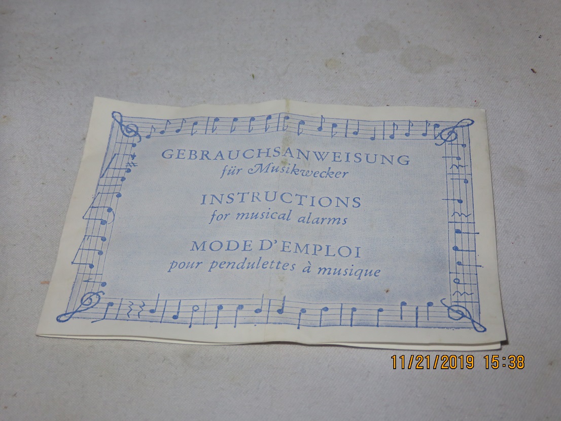 Instructions for musical alarm(s) included. See also A 061 019. |