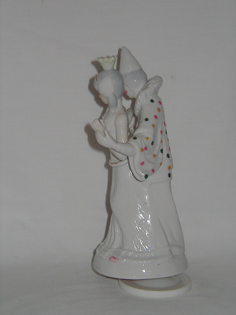 Same design and coloring as #1 A 178 004. But there are differences, slightly smaller, here lady's head same height as clown (in #1 a head lower), slightly different arm poses, clowns head her up much more (in #1 clown hangs head down), #2 heavier than #1. So either variance made in production (more handmade instead all out of same form) or copy. Therefore held in collection.