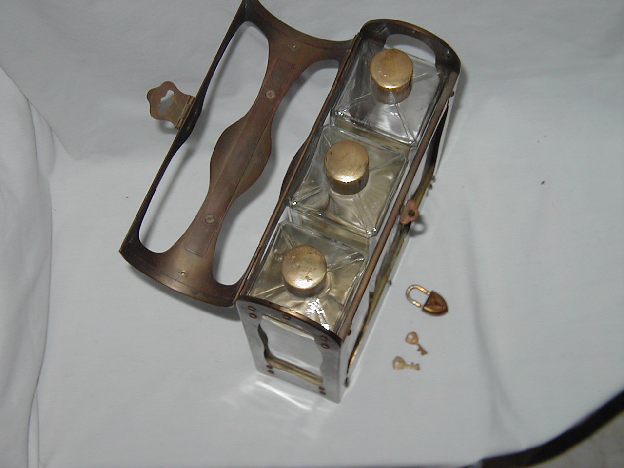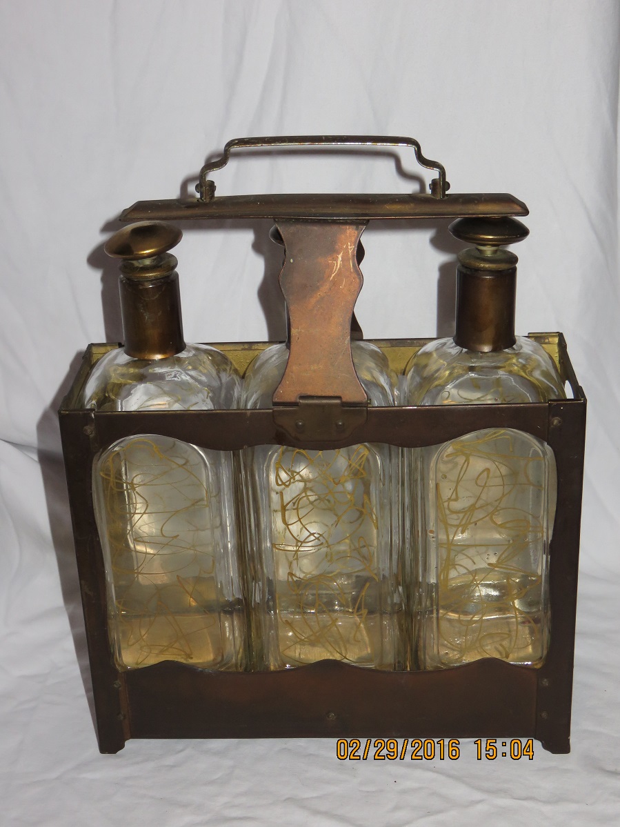 Metal frame, with three square clear glass bottles |