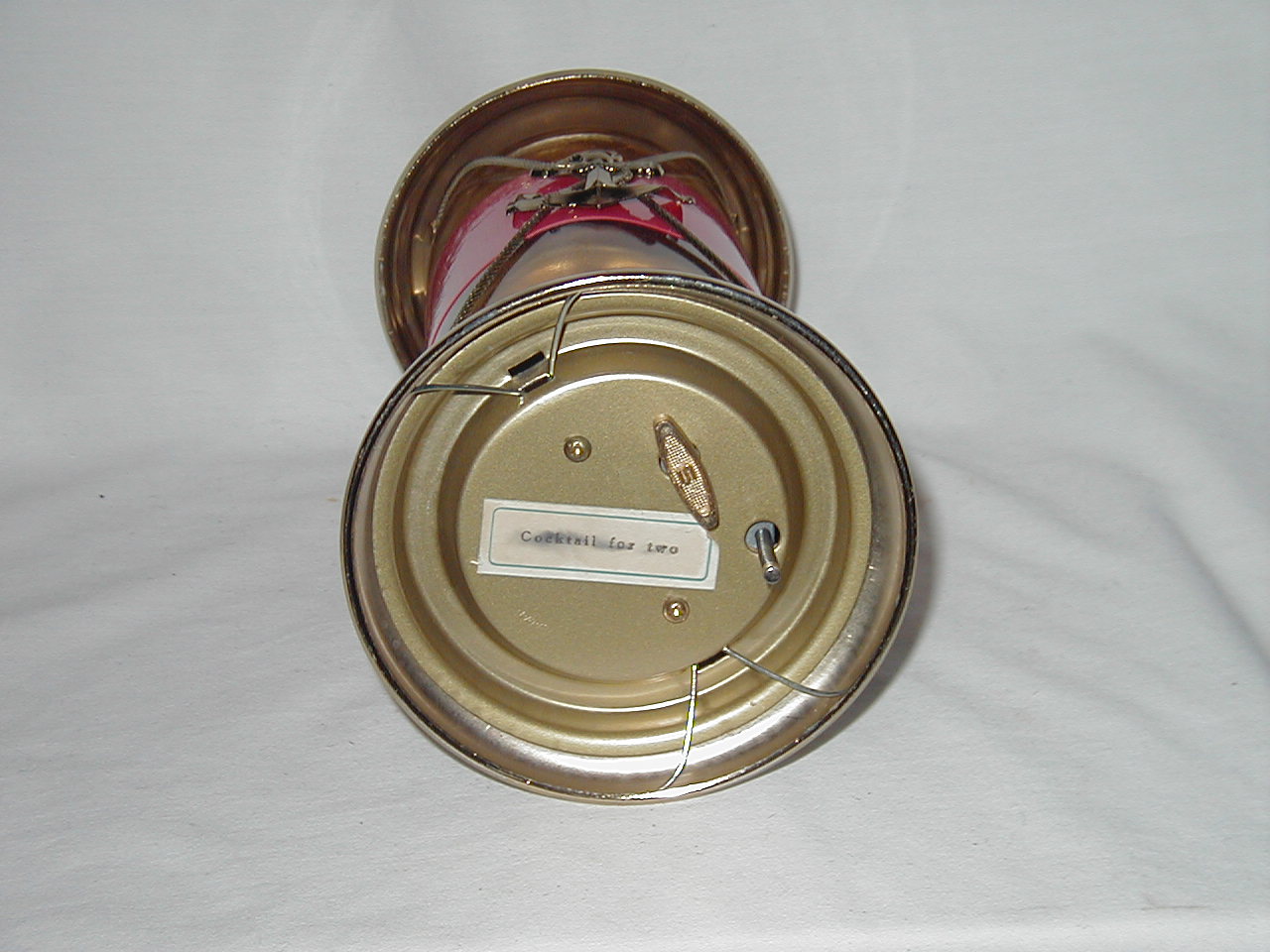Key, metal, in bottom. Music only plays when decanter is lifted. |