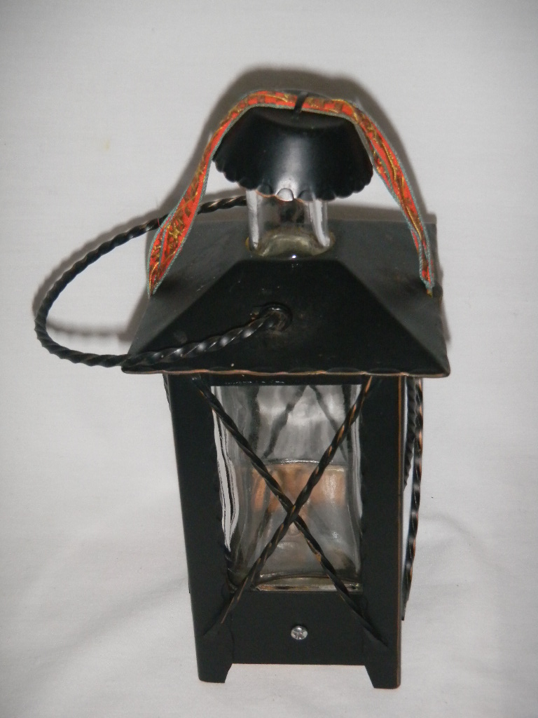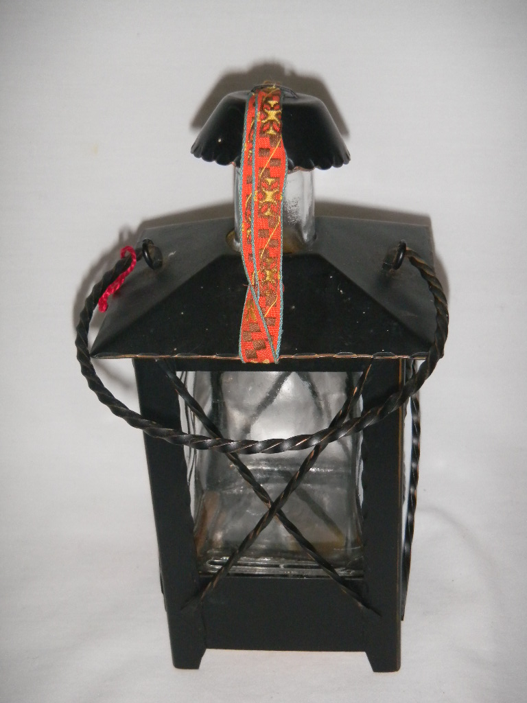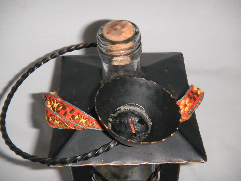 Metal frame, with inner glass bottle, metal cap on ribbon |