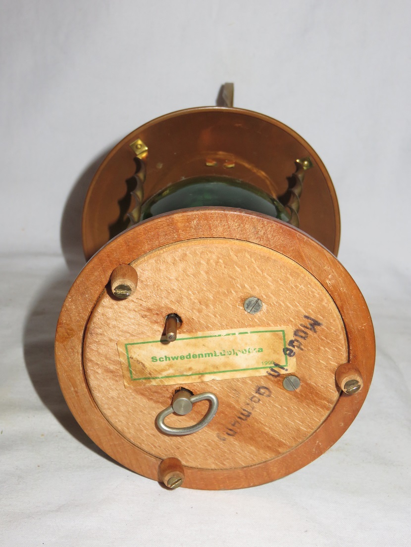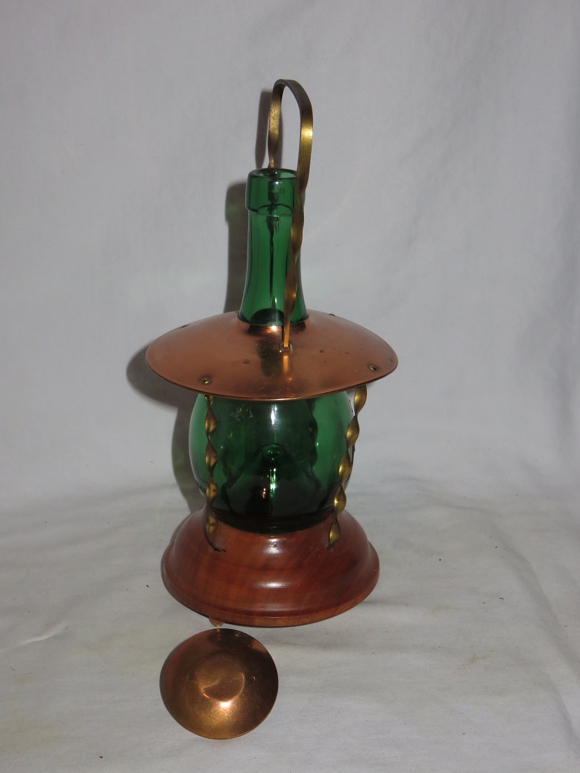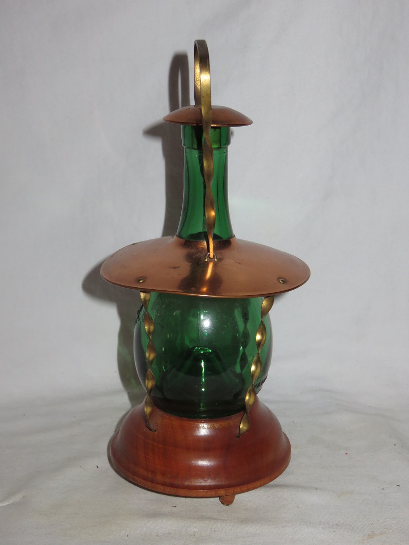 Wooden bottom, metal frame, with inner green glass bottle |