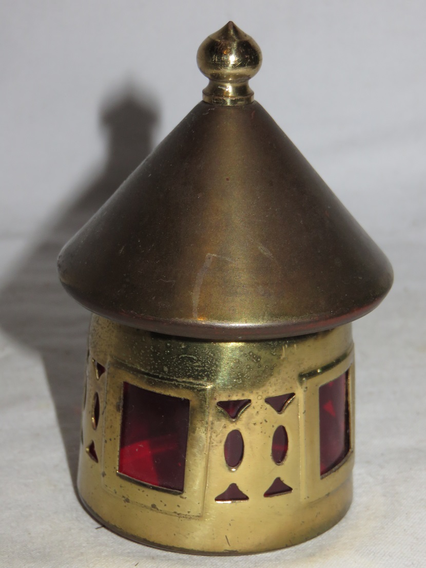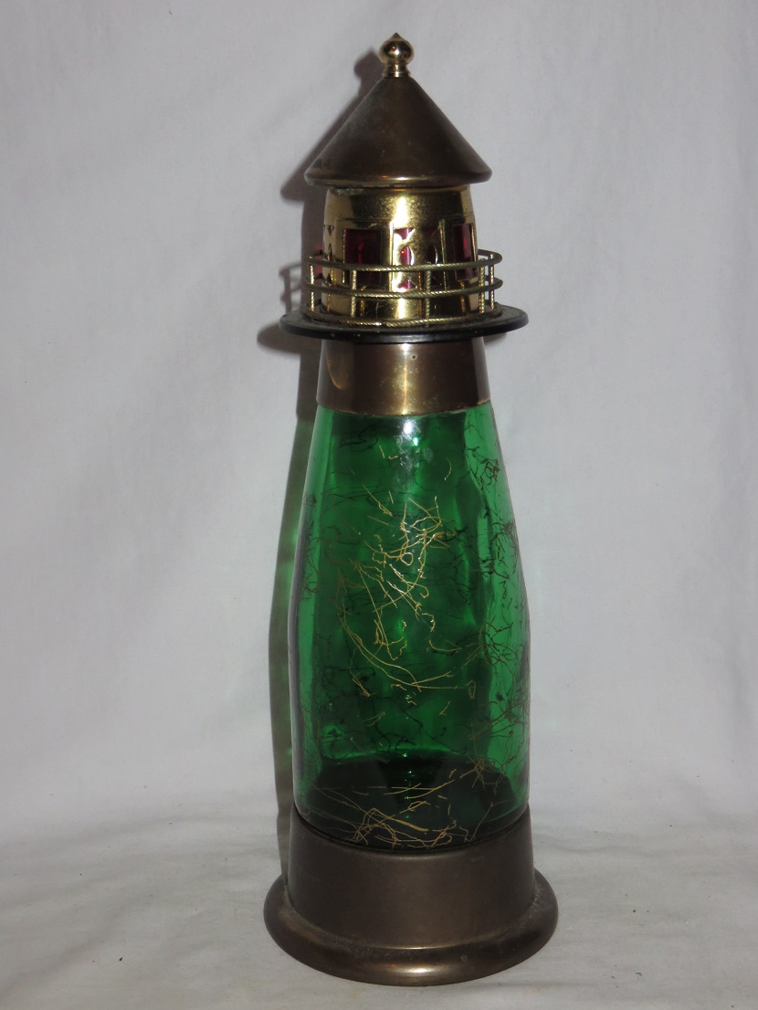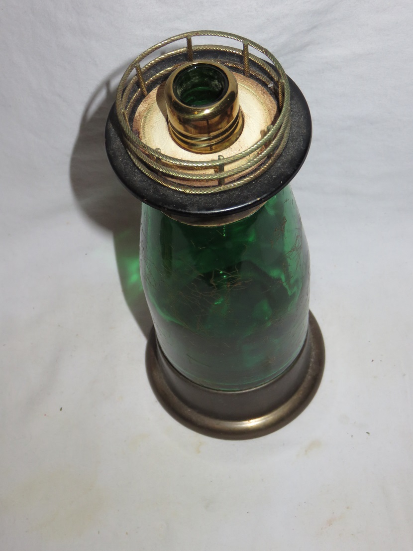 Metal, with inner green glass bottle with gold swirls |