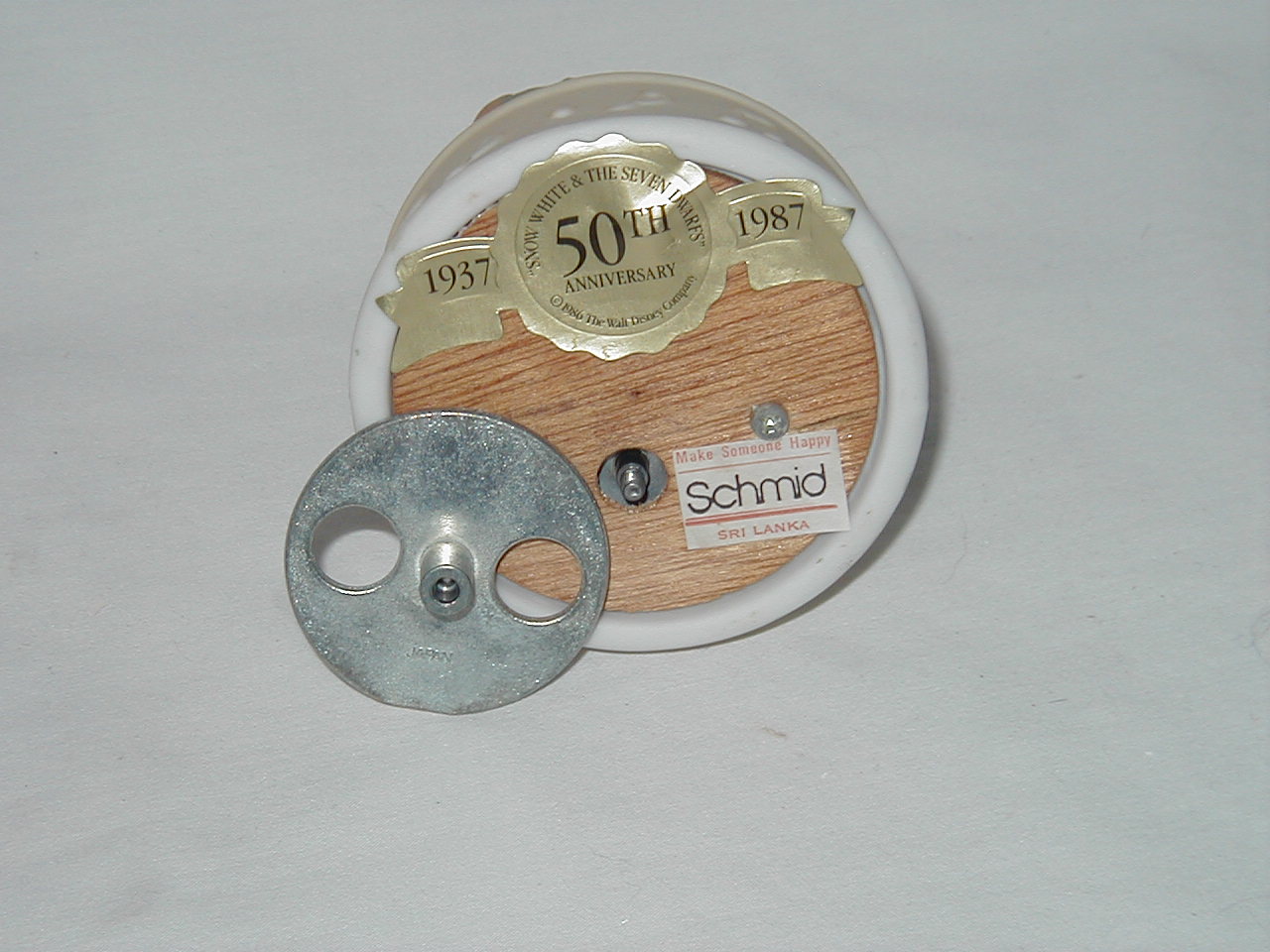 Item carries also label: ' Snow White and the Seven Dwarfs 50th Anniversary 1937-1987 c 1986 The Walt Disney Company '. Also inscribed in rim in back: ' Walt Disney '.