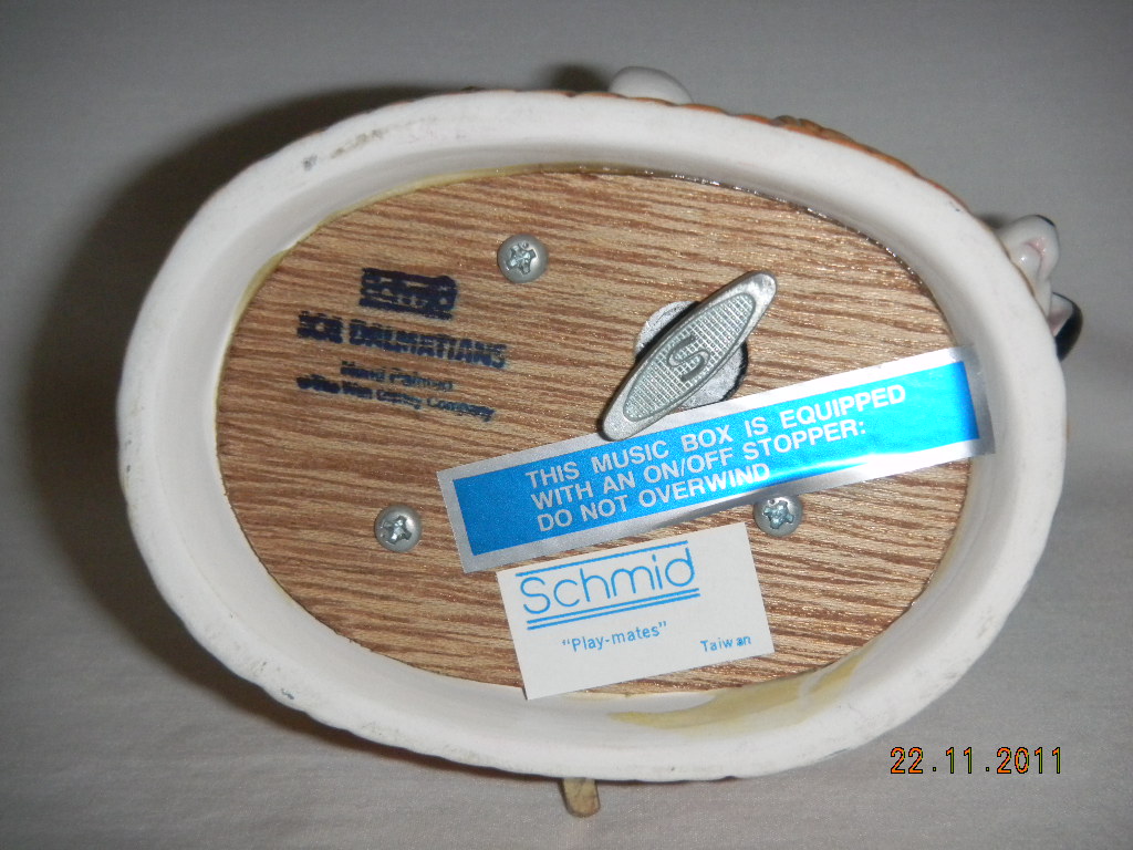 Also label on bottom: ' This music box is equipped with an on/off stopper; do not overwind '. |
