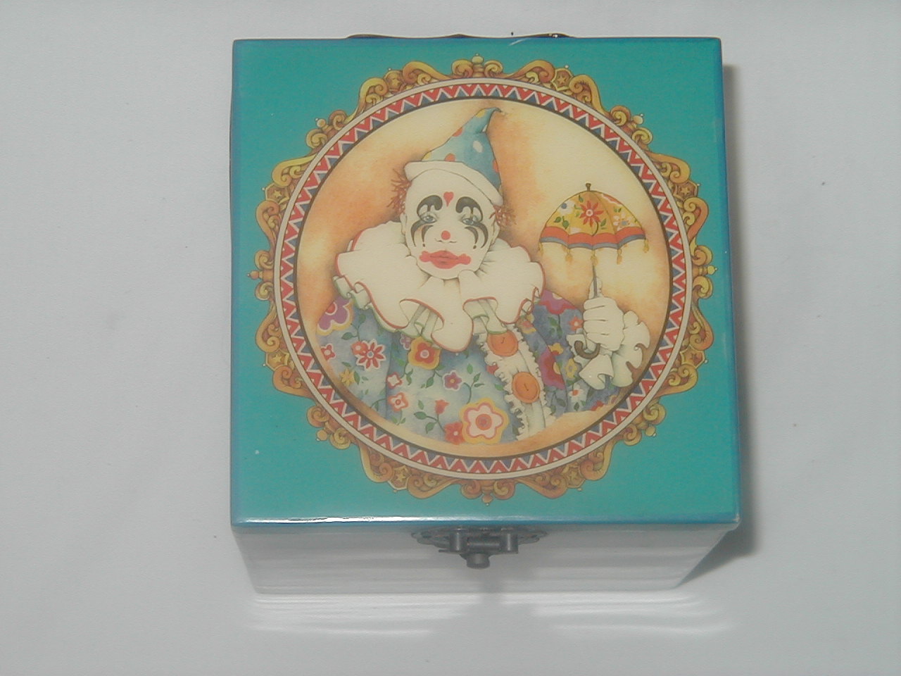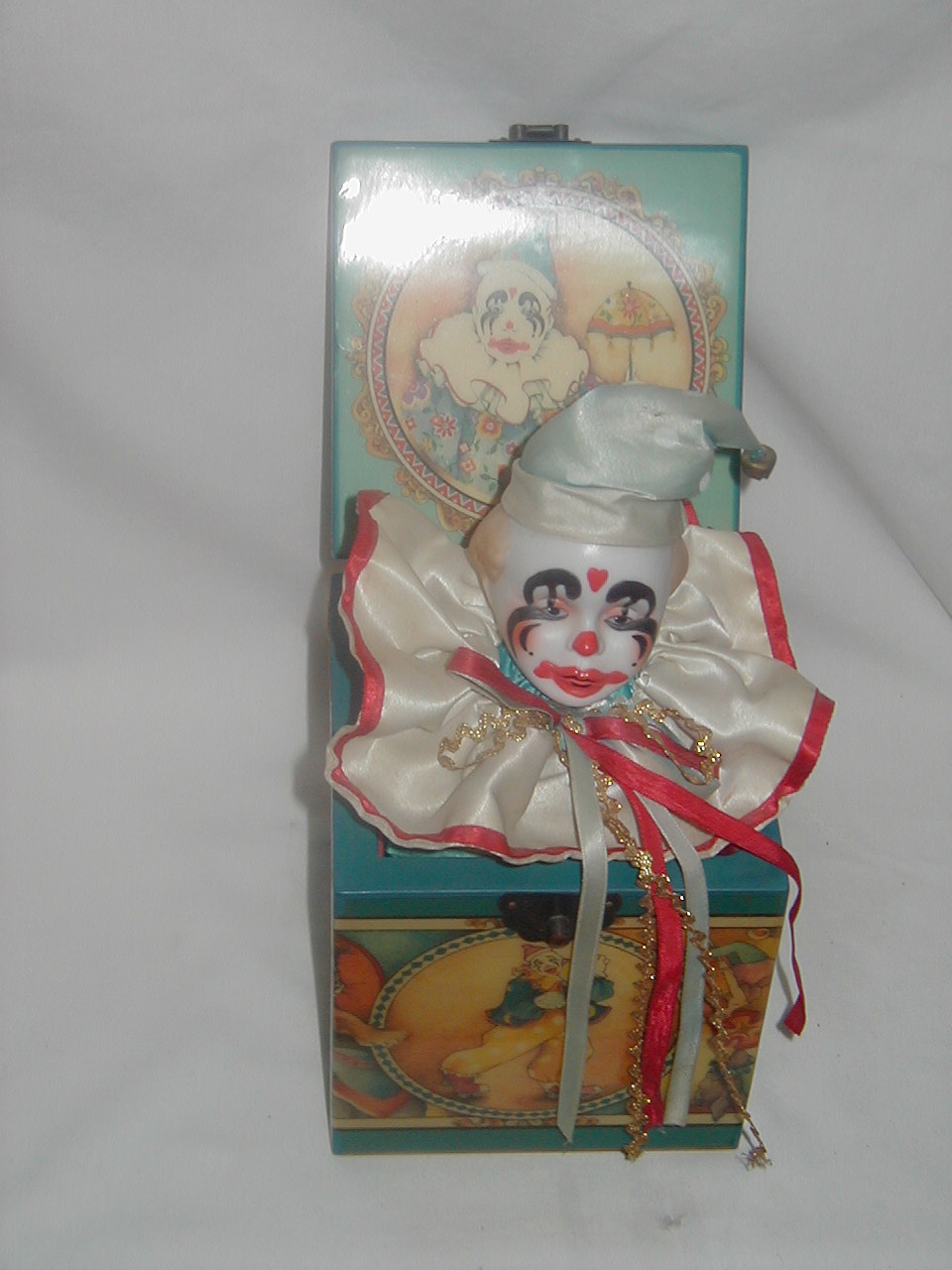 On bottom stencilled text a.o.: 'Willie the Clown, Musical Jack-in-the-Box. The piece is strictly limited to an edition of 10,000. Number 6326." It is not strictly a jack-in the-box as clown does not spring up/out the box when the music plays, only when the lid is opened manually.