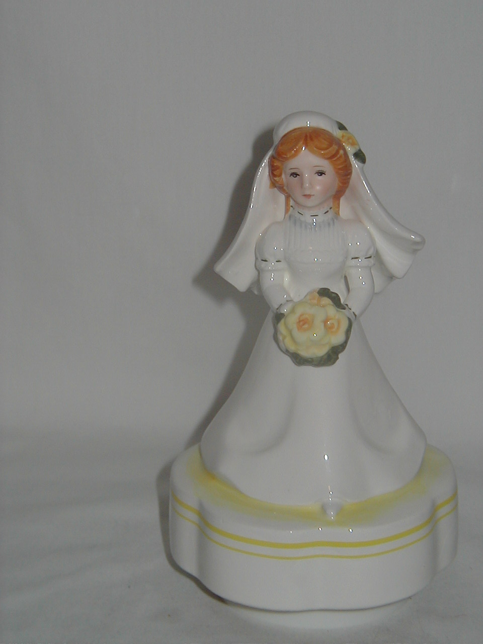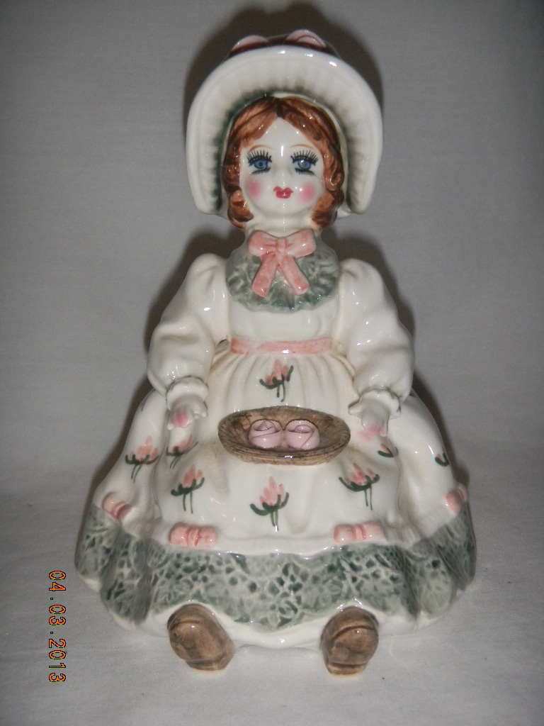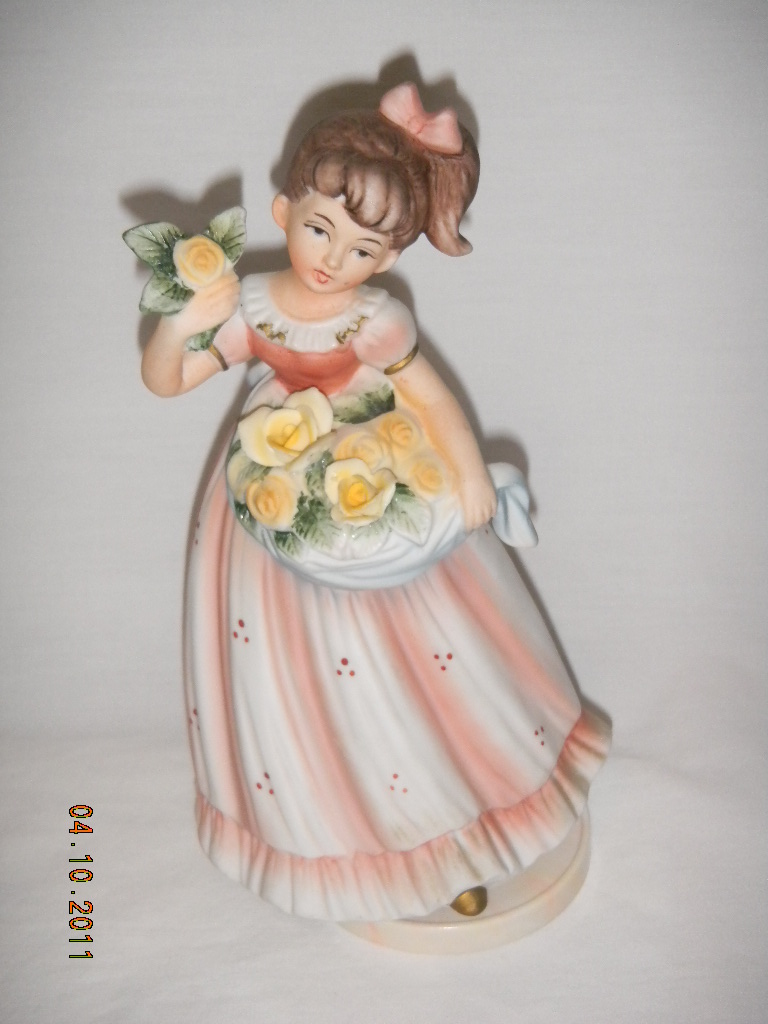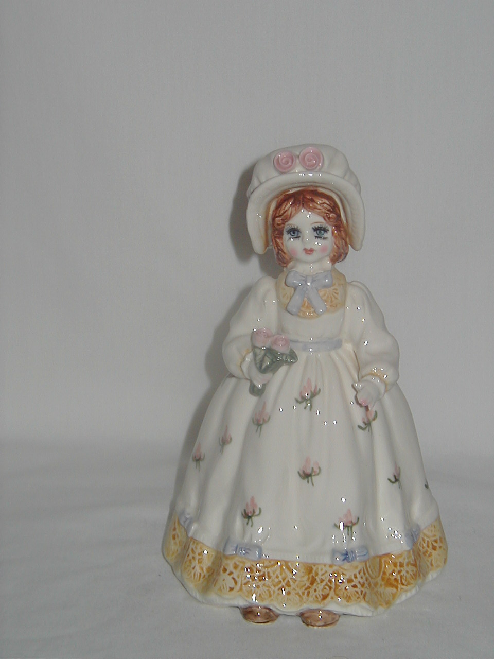 Lefton Lady in White Dress with Yellow Border at Bottom and Roses