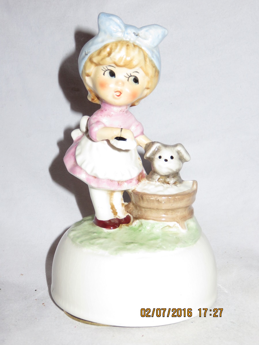 Lefton Girl in Yellow with Birthday Cake with Three Candles and Dog