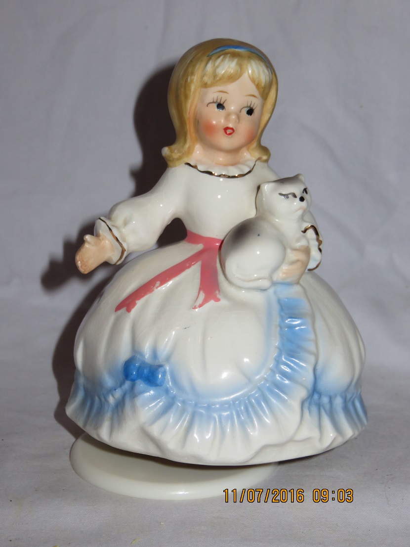 Schmid Young Lady White Dress Blue Frills with Cat in Hand