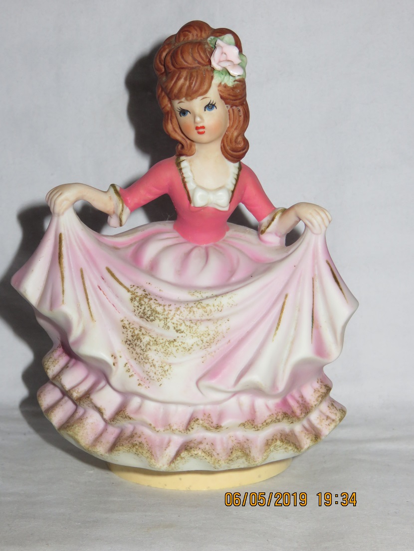 Josef Originals Lady in Flower Decorated Pink Dress with Golden Fan
