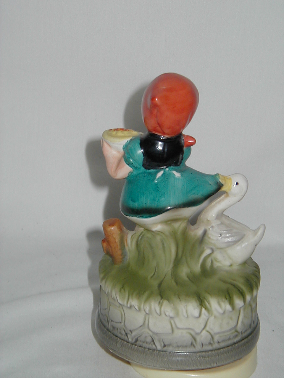 This collection of Old Japan Figurines i consider to be the best example of what Japan has contributed to the world of small and affordable music boxes. All the figurines are done in the same style and coloring, are well executed in detail and are easily recognizable. They can even be compared with Hummel's. I estimate the period they were being produced as the sixties and seventies (no markings, therefore an estimate). A great many different objects in this style were produced of which this collection gives an idea, although it is not complete by a long shot.