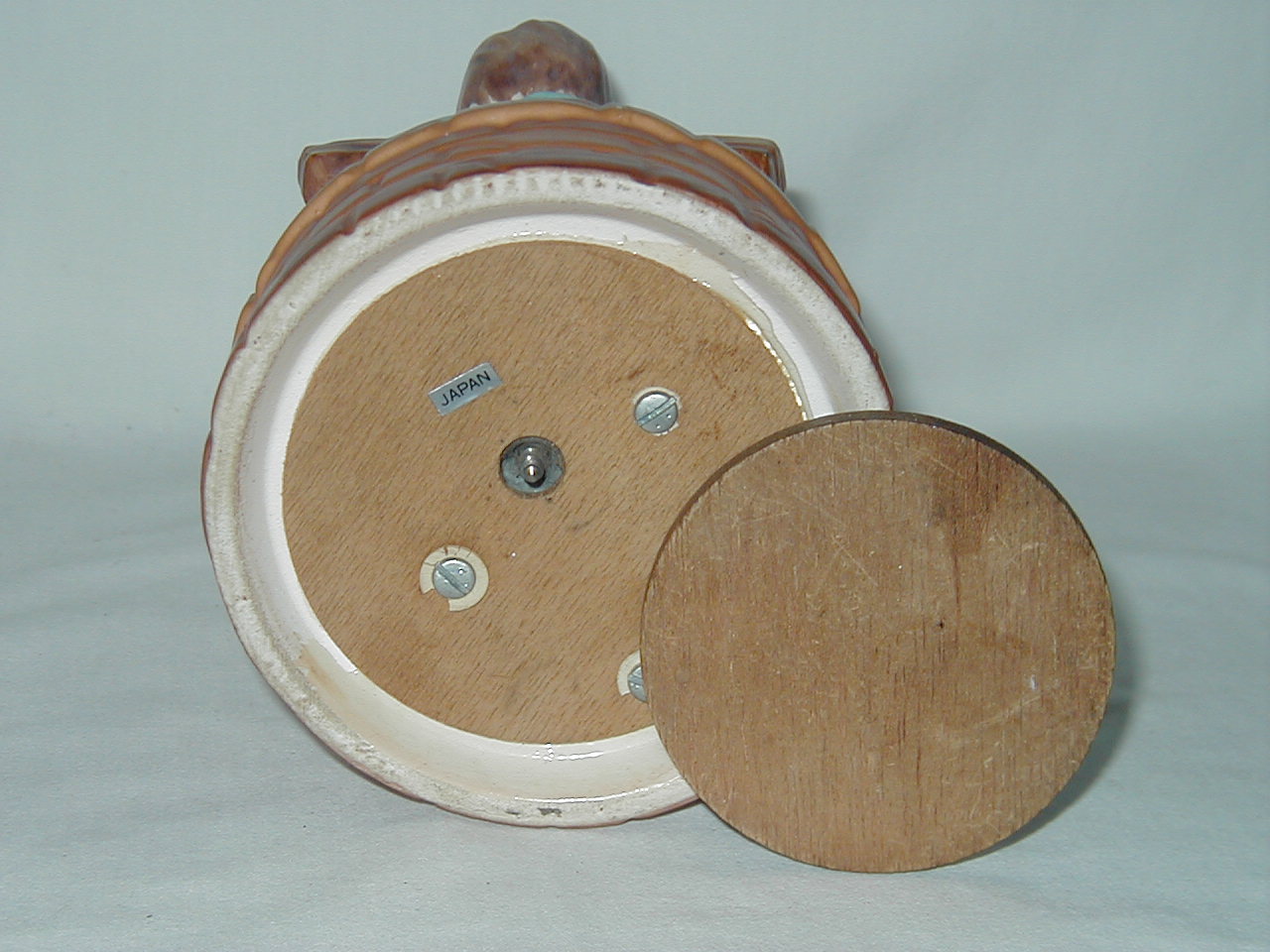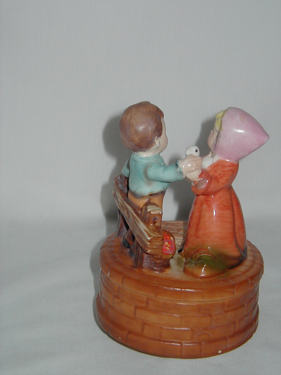 Fair, small chip on dress girl, chips on rim. Metal connector on foot to music mechanism reset on foot out of center. |