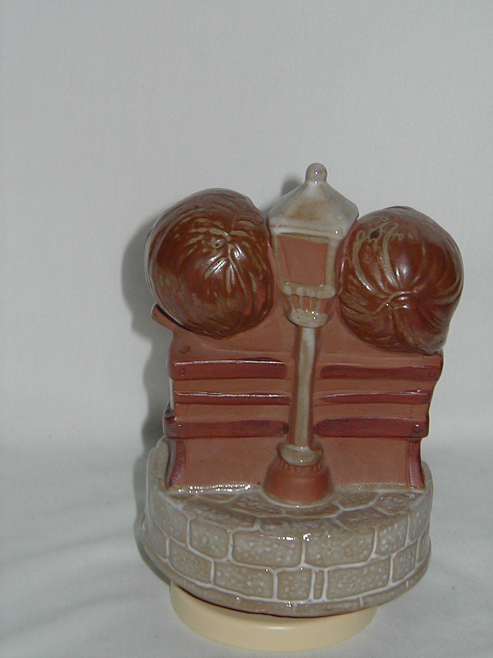 This collection of Old Japan Figurines i consider to be the best example of what Japan has contributed to the world of small and affordable music boxes. All the figurines are done in the same style and coloring, are well executed in detail and are easily recognizable. They can even be compared with Hummel's. I estimate the period they were being produced as the sixties and seventies (no markings, therefore an estimate). A great many different objects in this style were produced of which this collection gives an idea, although it is not complete by a long shot. This item with 'Dark Coloring' and part glazing is one of three in the collection, the others being A 121 002 and 060. I estimate these to be from the early seventies.