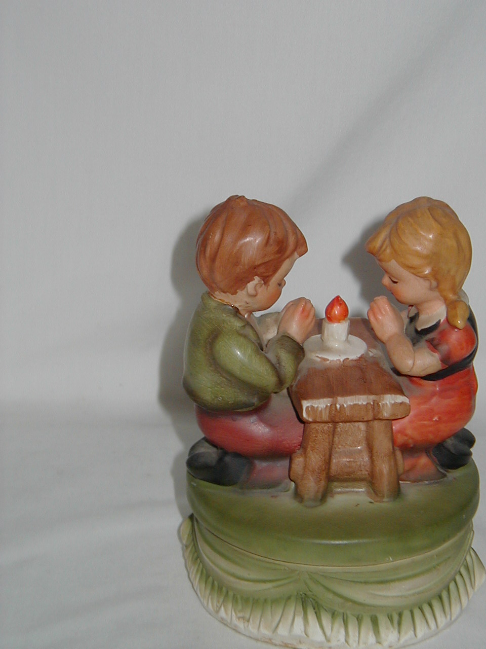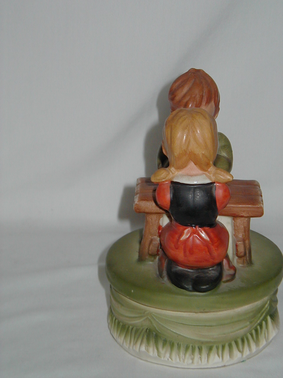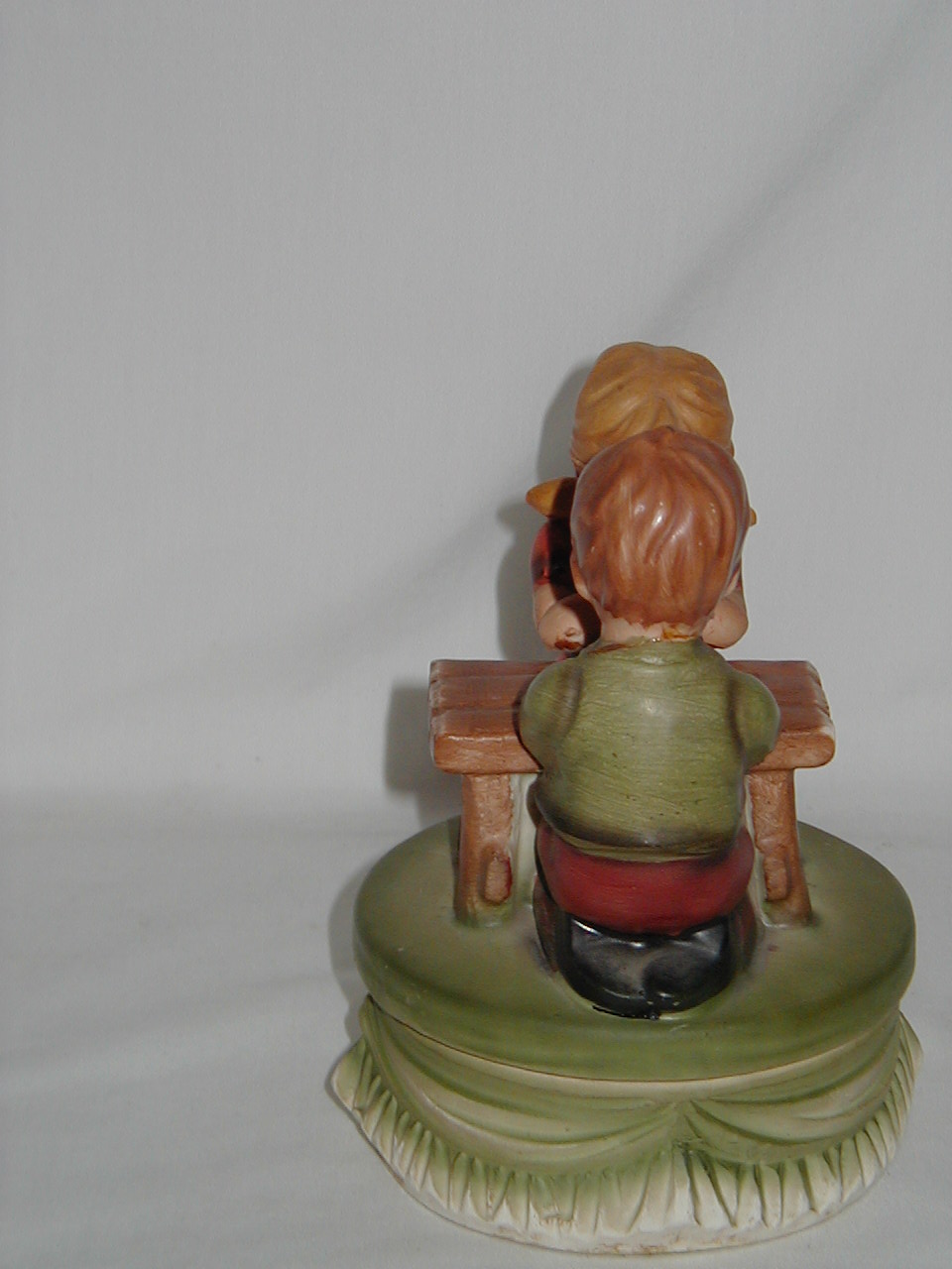 This collection of Old Japan Figurines i consider to be the best example of what Japan has contributed to the world of small and affordable music boxes. All the figurines are done in the same style and coloring, are well executed in detail and are easily recognizable. They can even be compared with Hummel's. I estimate the period they were being produced as the sixties and seventies (no markings, therefore an estimate). A great many different objects in this style were produced of which this collection gives an idea, although it is not complete by a long shot.