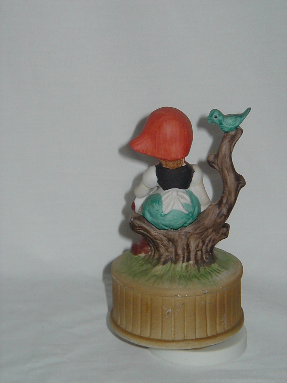 This collection of Old Japan Figurines i consider to be the best example of what Japan has contributed to the world of small and affordable music boxes. All the figurines are done in the same style and coloring, are well executed in detail and are easily recognizable. They can even be compared with Hummel's. I estimate the period they were being produced as the sixties and seventies (no markings, therefore an estimate). A great many different objects in this style were produced of which this collection gives an idea, although it is not complete by a long shot.