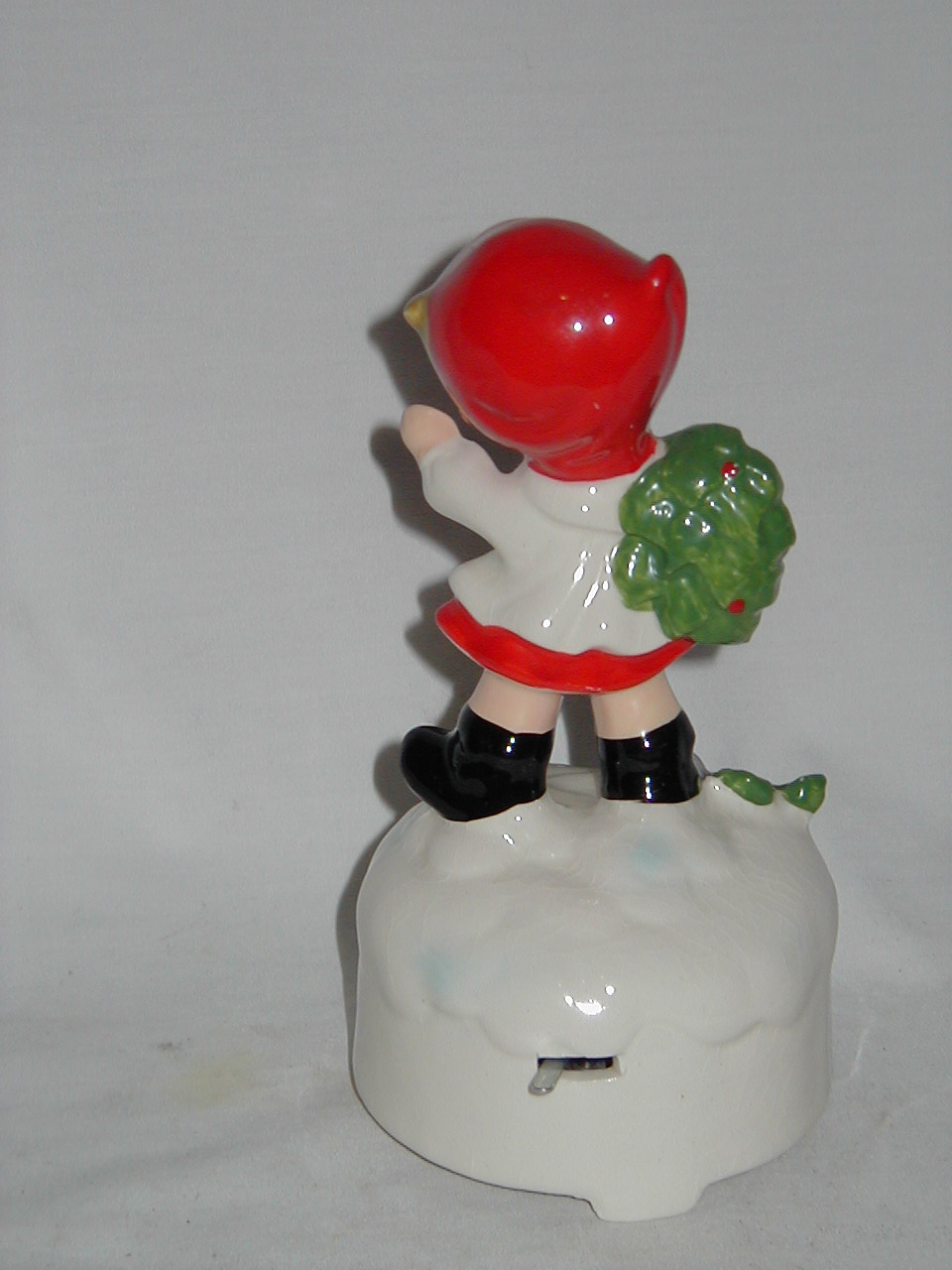 This collection of Old Japan Figurines i consider to be the best example of what Japan has contributed to the world of small and affordable music boxes. All the figurines are done in the same style and coloring, are well executed in detail and are easily recognizable. They can even be compared with Hummel's. I estimate the period they were being produced as the sixties and seventies (no markings, therefore an estimate). A great many different objects in this style were produced of which this collection gives an idea, although it is not complete by a long shot.