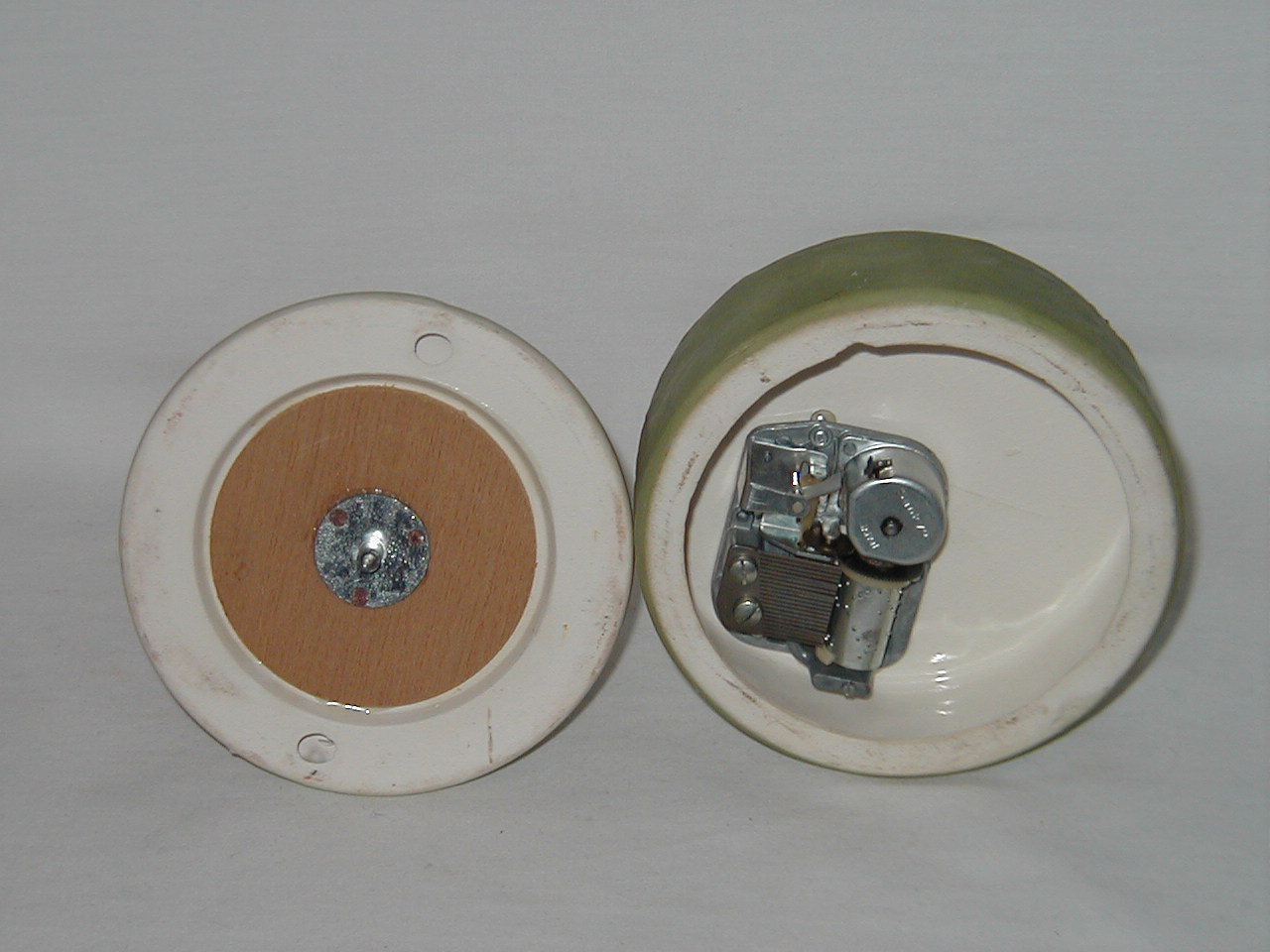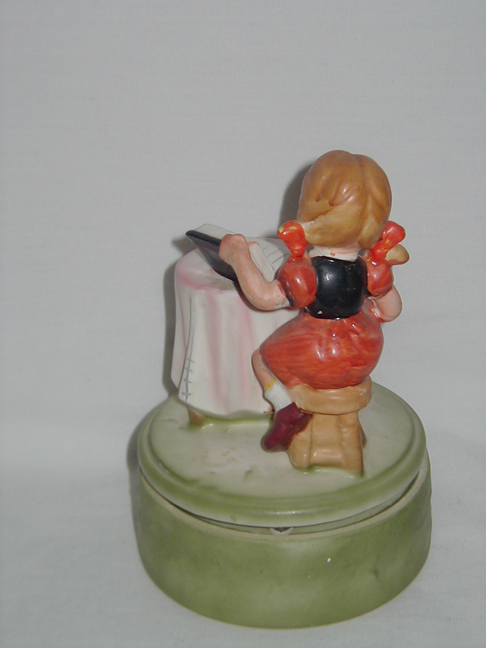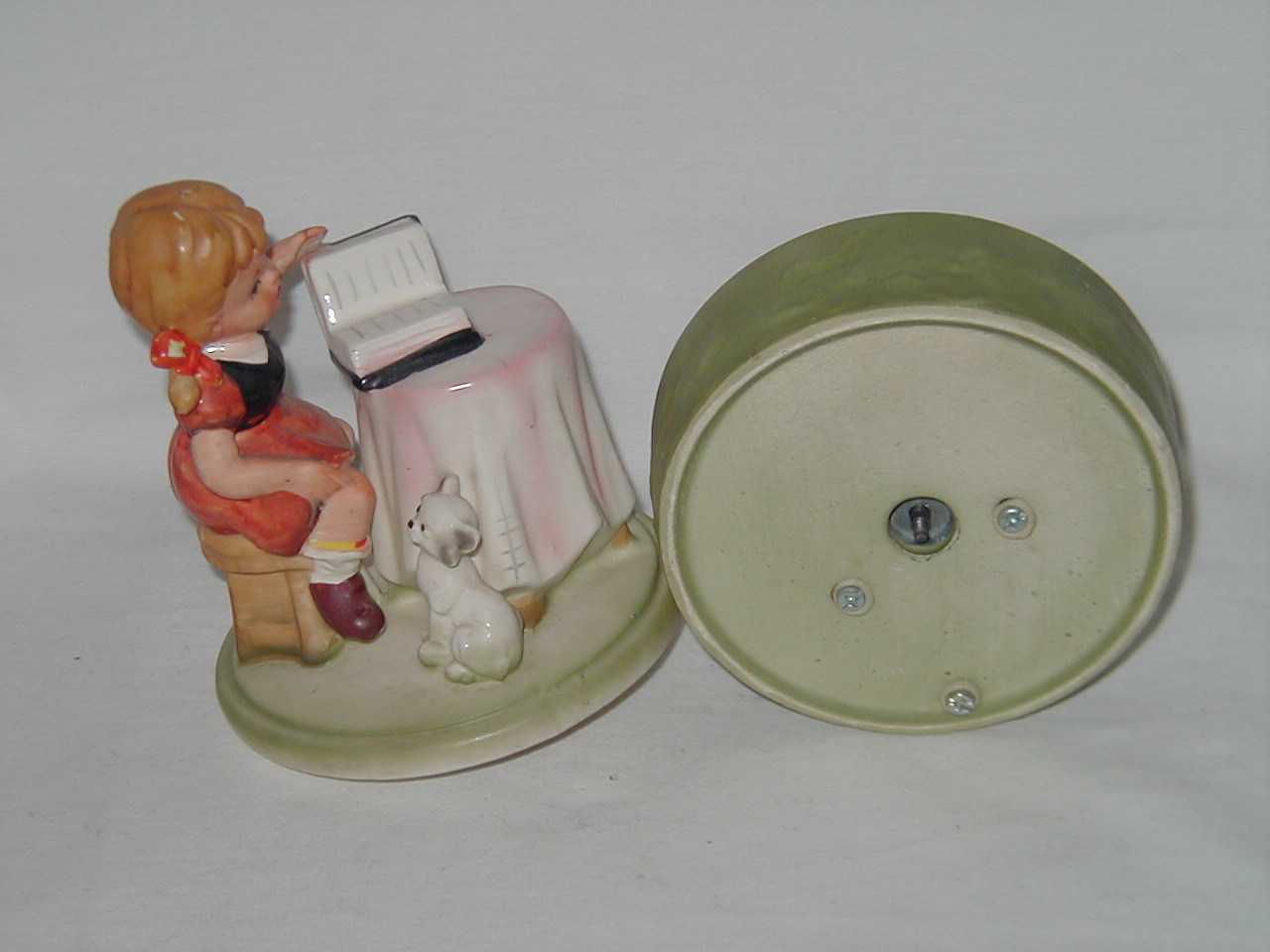 This collection of Old Japan Figurines i consider to be the best example of what Japan has contributed to the world of small and affordable music boxes. All the figurines are done in the same style and coloring, are well executed in detail and are easily recognizable. They can even be compared with Hummel's. I estimate the period they were being produced as the sixties and seventies (no markings, therefore an estimate). A great many different objects in this style were produced of which this collection gives an idea, although it is not complete by a long shot.
