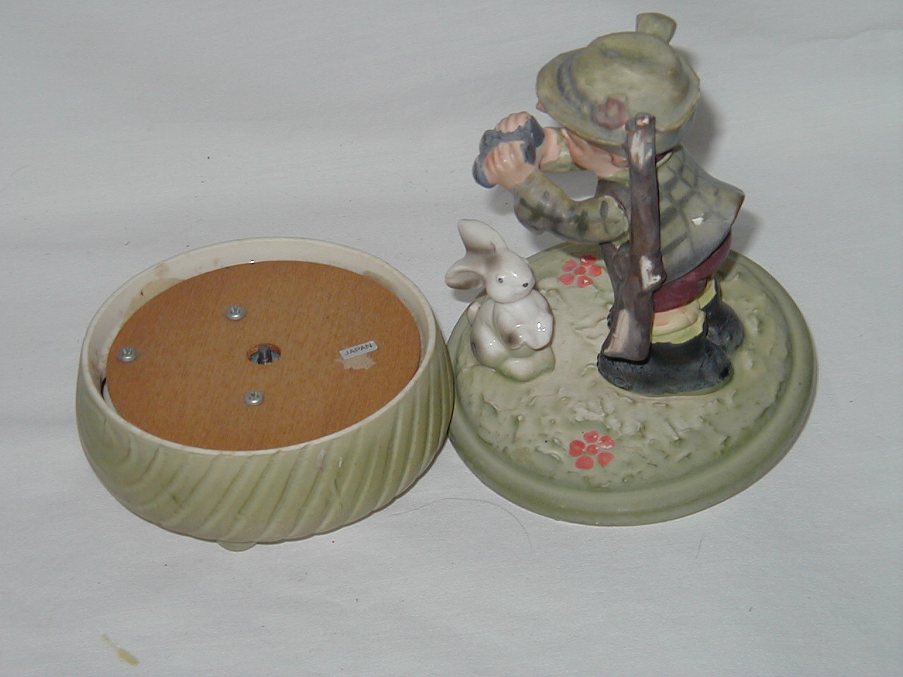 This collection of Old Japan Figurines i consider to be the best example of what Japan has contributed to the world of small and affordable music boxes. All the figurines are done in the same style and coloring, are well executed in detail and are easily recognizable. They can even be compared with Hummel's. I estimate the period they were being produced as the sixties and seventies (no markings, therefore an estimate). A great many different objects in this style were produced of which this collection gives an idea, although it is not complete by a long shot.