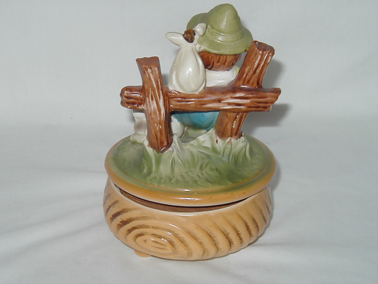 This collection of Old Japan Figurines i consider to be the best example of what Japan has contributed to the world of small and affordable music boxes. All the figurines are done in the same style and coloring, are well executed in detail and are easily recognizable. They can even be compared with Hummel's. I estimate the period they were being produced as the sixties and seventies (no markings, therefore an estimate). A great many different objects in this style were produced of which this collection gives an idea, although it is not complete by a long shot.