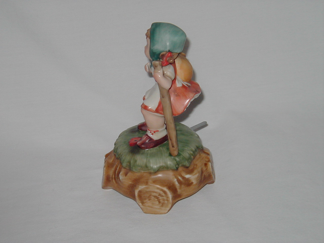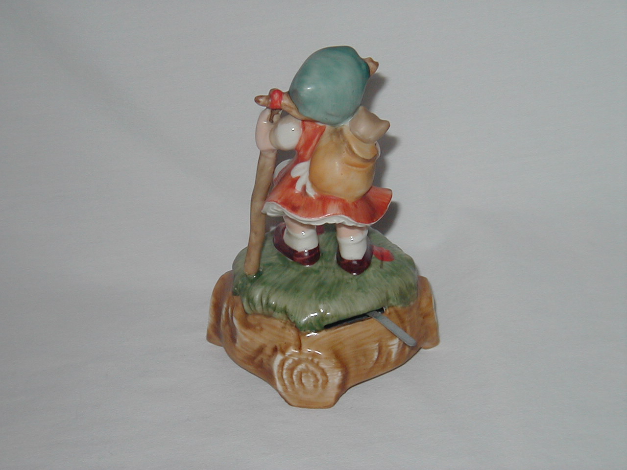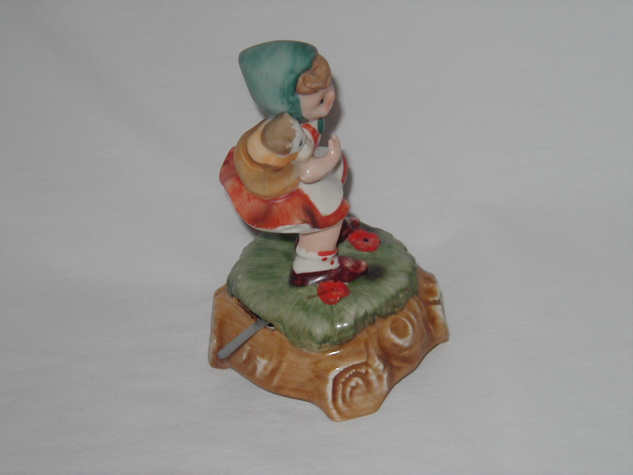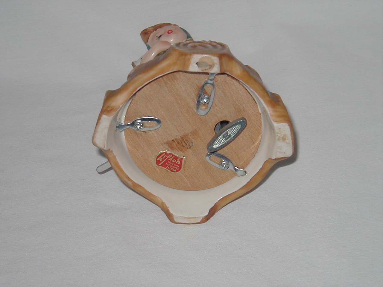 This collection of Old Japan Figurines i consider to be the best example of what Japan has contributed to the world of small and affordable music boxes. All the figurines are done in the same style and coloring, are well executed in detail and are easily recognizable. They can even be compared with Hummel's. I estimate the period they were being produced as the sixties and seventies (no markings, therefore an estimate). A great many different objects in this style were produced of which this collection gives an idea, although it is not complete by a long shot.