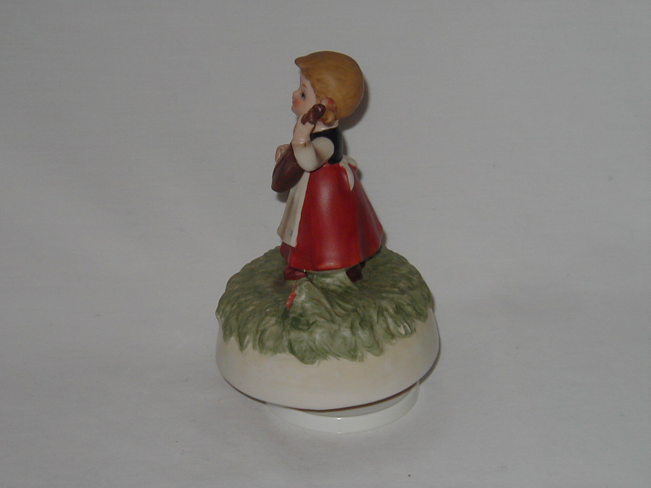 This collection of Old Japan Figurines i consider to be the best example of what Japan has contributed to the world of small and affordable music boxes. All the figurines are done in the same style and coloring, are well executed in detail and are easily recognizable. They can even be compared with Hummel's. I estimate the period they were being produced as the sixties and seventies (no markings, therefore an estimate). A great many different objects in this style were produced of which this collection gives an idea, although it is not complete by a long shot.