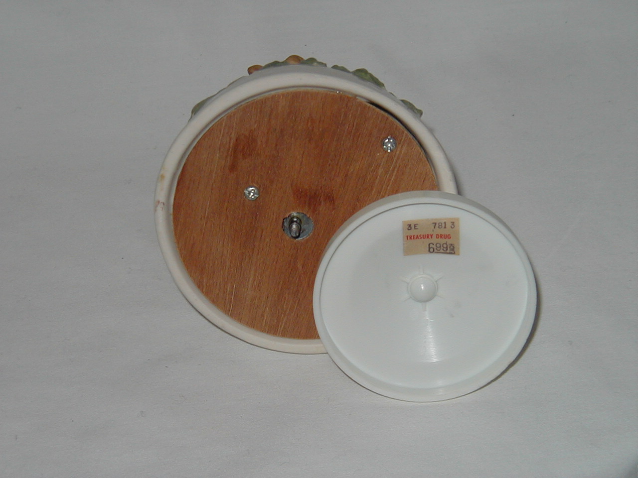 Box No Information on Box x Est. Origin x Est. Year/Period x Music Mechanism housed in Bottom Distributor Treasure drug (sales label $6.99) On/Off Switch No Activate Music Turn foot clockwise Weight in Lbs 0.75 Moving Parts Rotates on foot with music. On Foot/Pedestal Yes, plastic. Remarks on Condition Good Misc. Information x