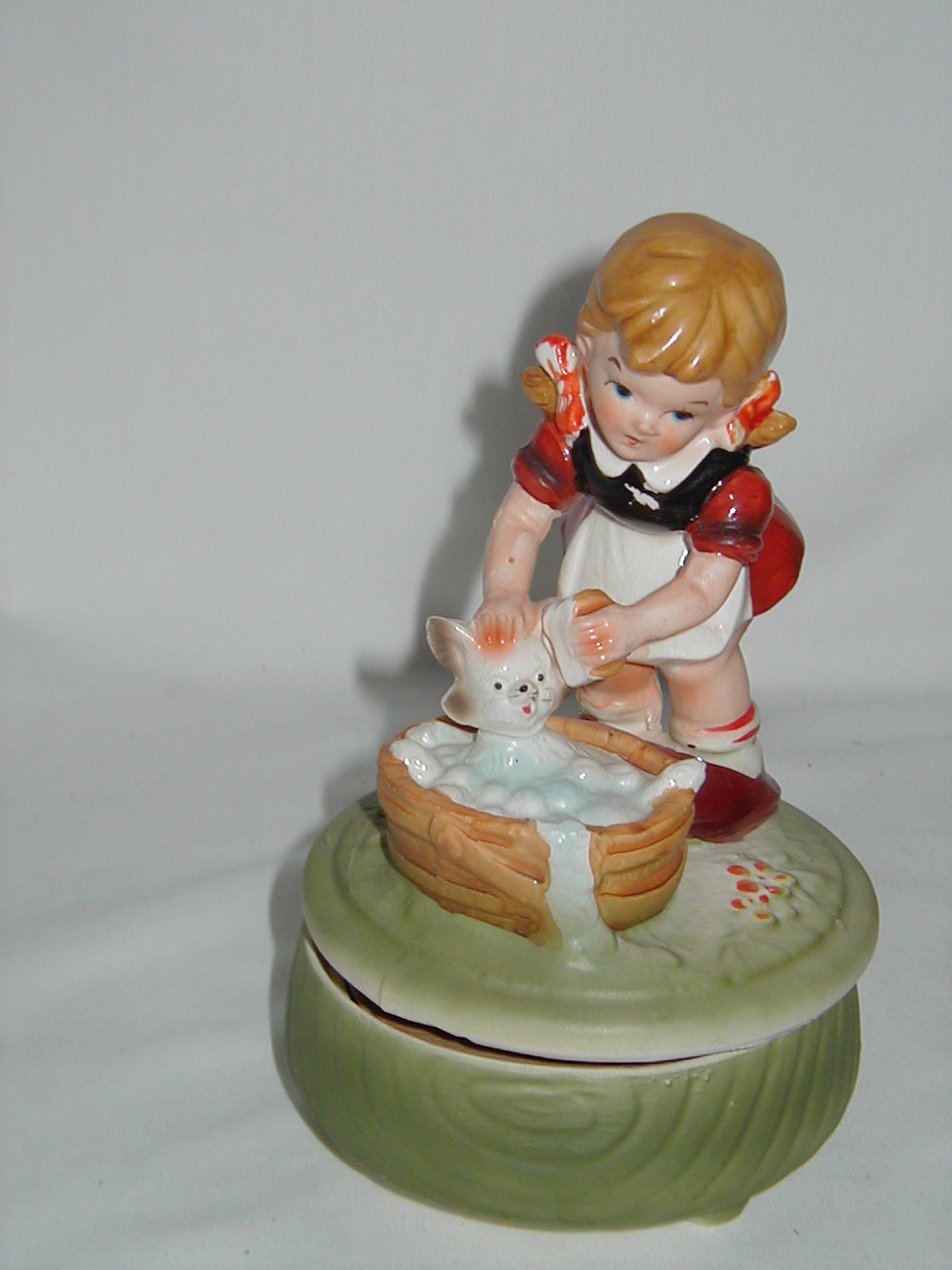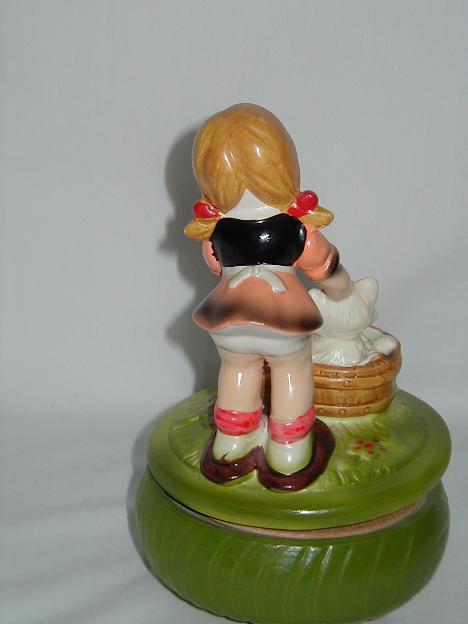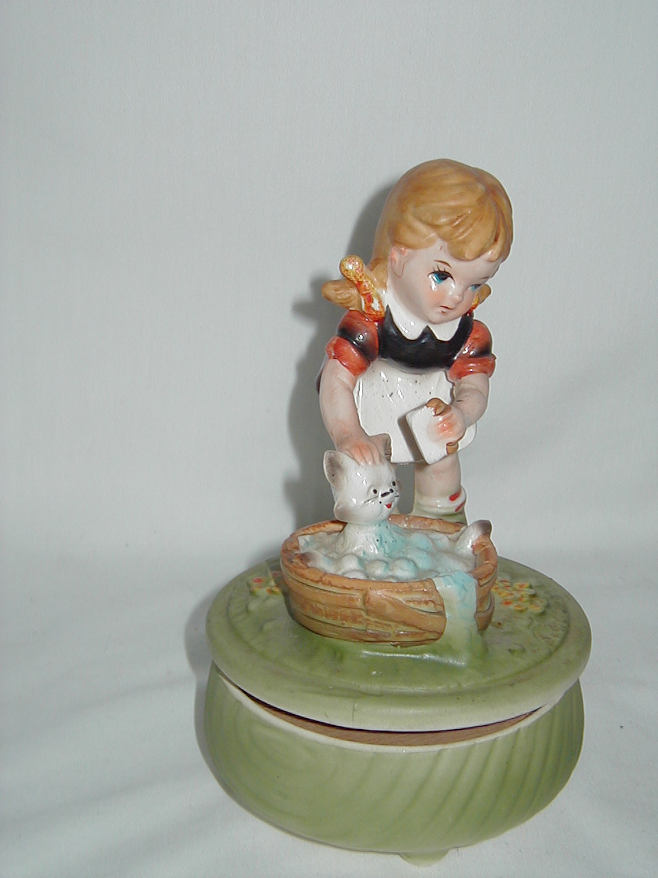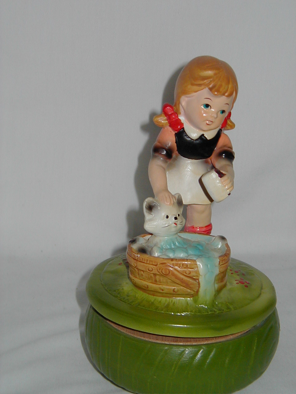 This collection of Old Japan Figurines i consider to be the best example of what Japan has contributed to the world of small and affordable music boxes. All the figurines are done in the same style and coloring, are well executed in detail and are easily recognizable. They can even be compared with Hummel's. I estimate the period they were being produced as the sixties and seventies (no markings, therefore an estimate). A great many different objects in this style were produced of which this collection gives an idea, although it is not complete by a long shot. All 4 figurines are from the same mold, but some differences exist. The main difference in my opinion is the left arm of the girl which in #1 is close to the cat's face and in following #'s 2, 3 and 4 get ever further from the cat's face. Also #4 does not have a Price label but lettering/stencil under pedestal (E.A.Price Inc in stead of Price Imports for other three and carries date 1977, none of the others have dating). Also the green from #4 is different, more brilliant than other 3. But all 4 carry the same tune (which i cannot name, unfortunately). There are some small other differences in coloring, ribbons in hair from yellow to red and in between, etc. Also, #4 weighs 0.85 lbs while the other 3 each weigh 1.0 lbs, so there must be a production difference. And #'s 1 and 2 are about one inch smaller in height, girl seems to squat more, just production variances in time, i believe.