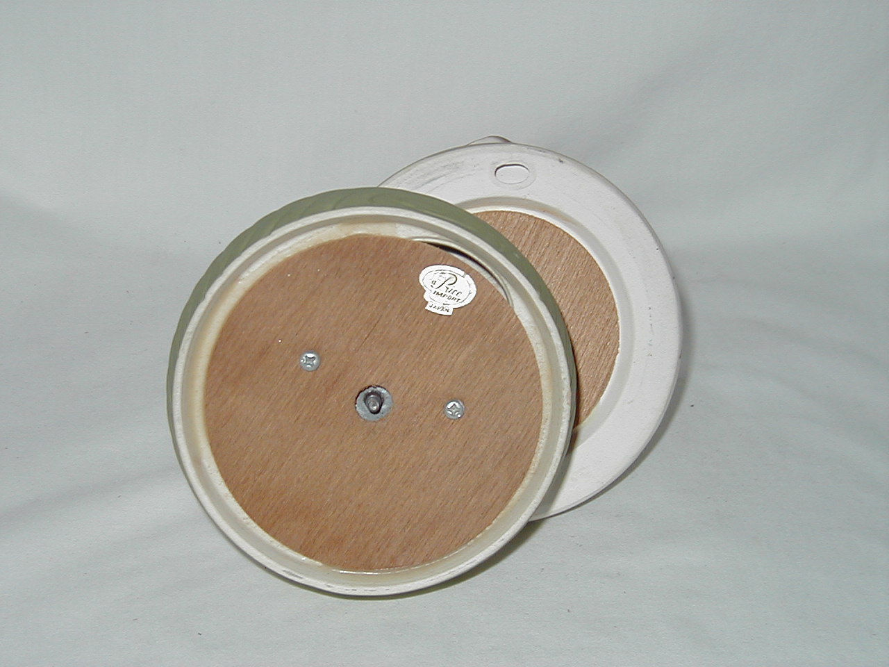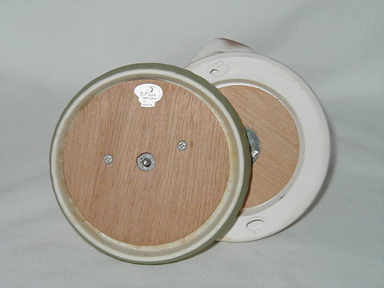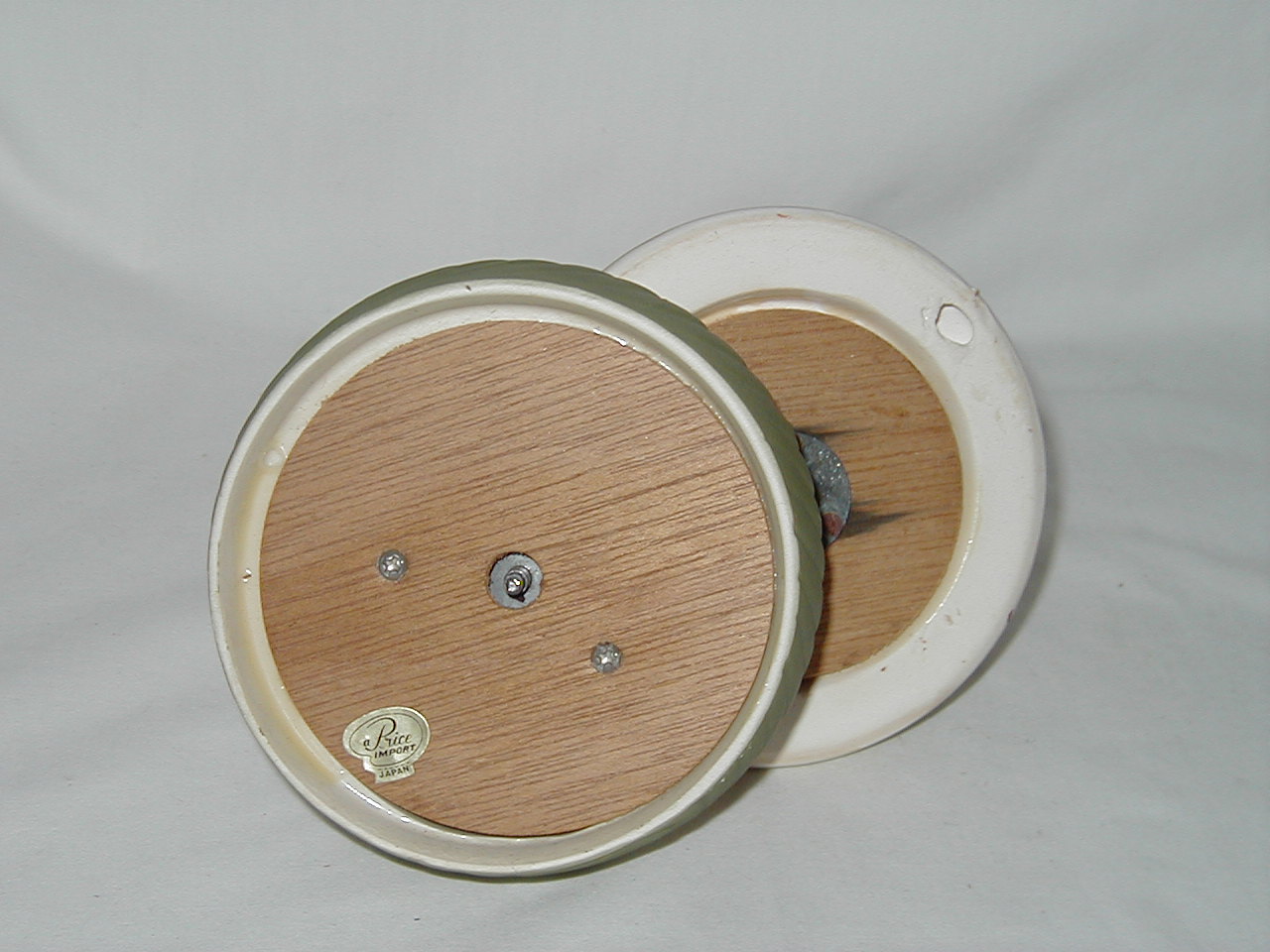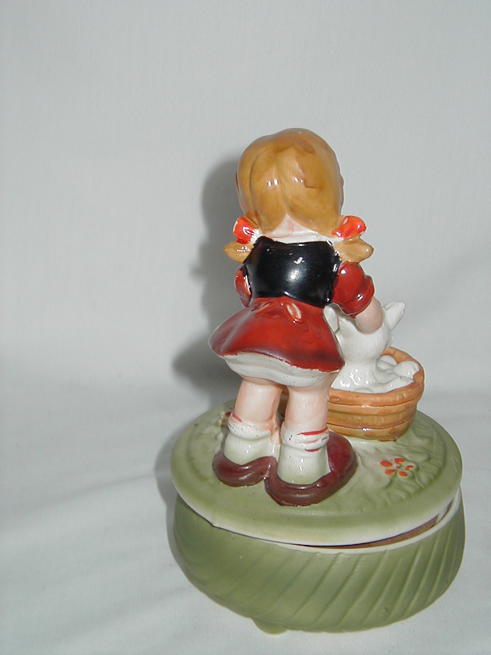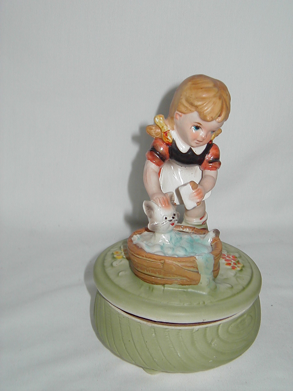 This collection of Old Japan Figurines i consider to be the best example of what Japan has contributed to the world of small and affordable music boxes. All the figurines are done in the same style and coloring, are well executed in detail and are easily recognizable. They can even be compared with Hummel's. I estimate the period they were being produced as the sixties and seventies (no markings, therefore an estimate). A great many different objects in this style were produced of which this collection gives an idea, although it is not complete by a long shot. All 4 figurines are from the same mold, but some differences exist. The main difference in my opinion is the left arm of the girl which in #1 is close to the cat's face and in following #'s 2, 3 and 4 get ever further from the cat's face. Also #4 does not have a Price label but lettering/stencil under pedestal (E.A.Price Inc in stead of Price Imports for other three and carries date 1977, none of the others have dating). Also the green from #4 is different, more brilliant than other 3. But all 4 carry the same tune (which i cannot name, unfortunately). There are some small other differences in coloring, ribbons in hair from yellow to red and in between, etc. Also, #4 weighs 0.85 lbs while the other 3 each weigh 1.0 lbs, so there must be a production difference. And #'s 1 and 2 are about one inch smaller in height, girl seems to squat more, just production variances in time, i believe.