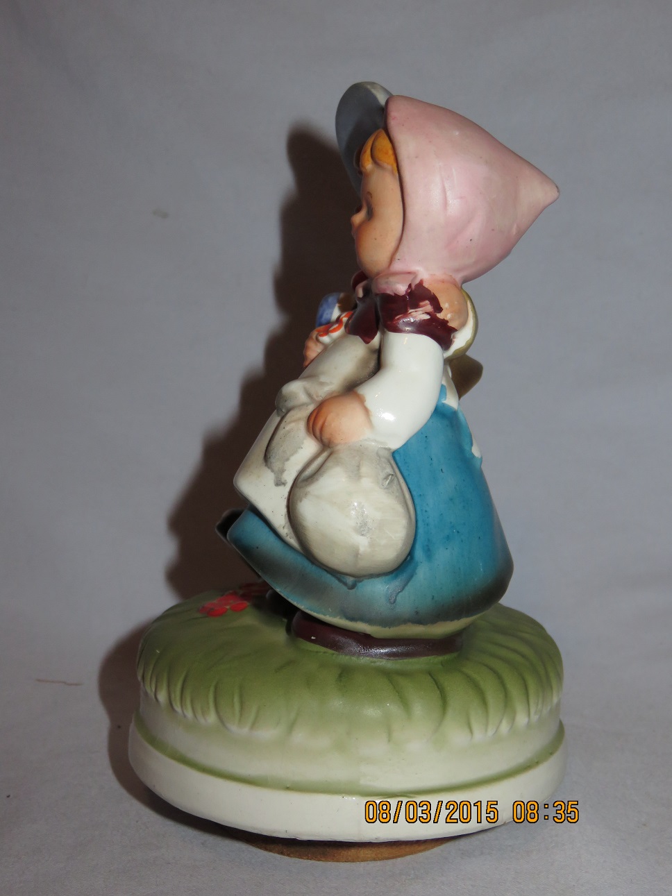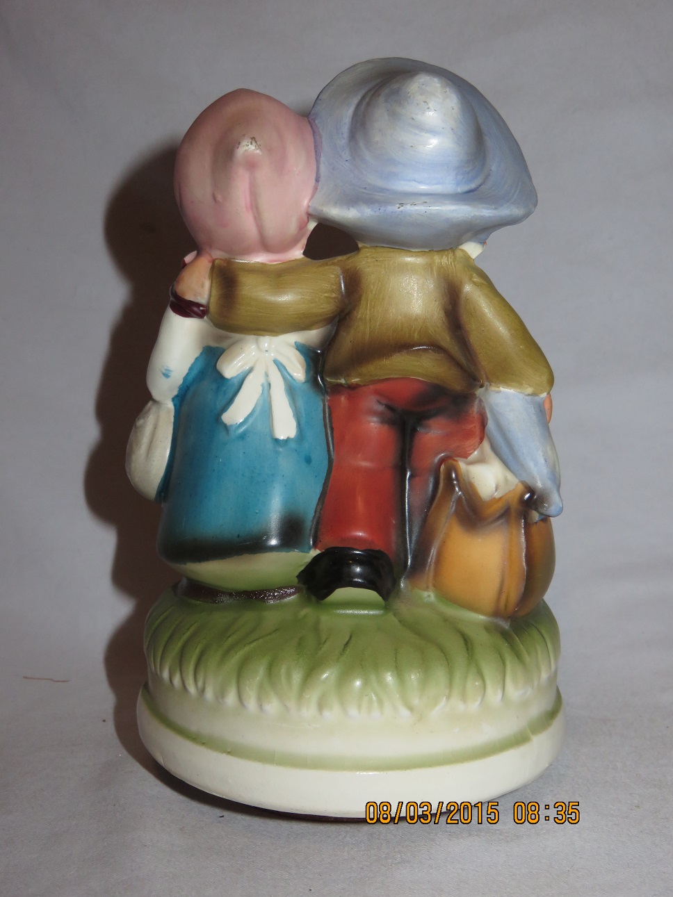 This collection of Old Japan Figurines i consider to be the best example of what Japan has contributed to the world of small and affordable music boxes. All the figurines are done in the same style and coloring, are well executed in detail and are easily recognizable. They can even be compared with Hummel's. I estimate the period they were being produced as the sixties and seventies (no markings, therefore an estimate). A great many different objects in this style were produced of which this collection gives an idea, although it is not complete by a long shot.