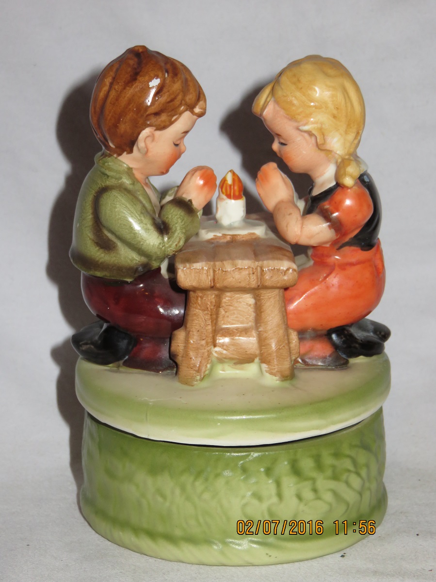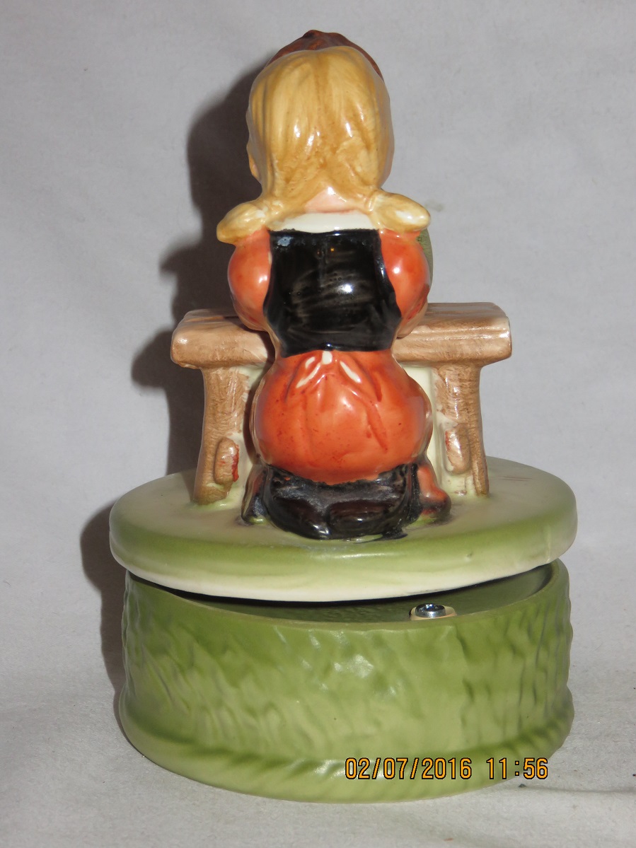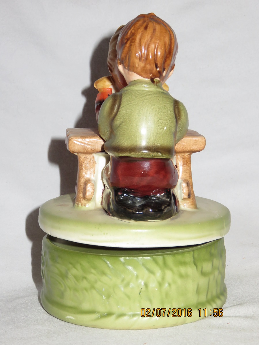 This collection of Old Japan Figurines i consider to be the best example of what Japan has contributed to the world of small and affordable music boxes. All the figurines are done in the same style and coloring, are well executed in detail and are easily recognizable. They can even be compared with Hummel's. I estimate the period they were being produced as the sixties and seventies (no markings, therefore an estimate). A great many different objects in this style were produced of which this collection gives an idea, although it is not complete by a long shot.