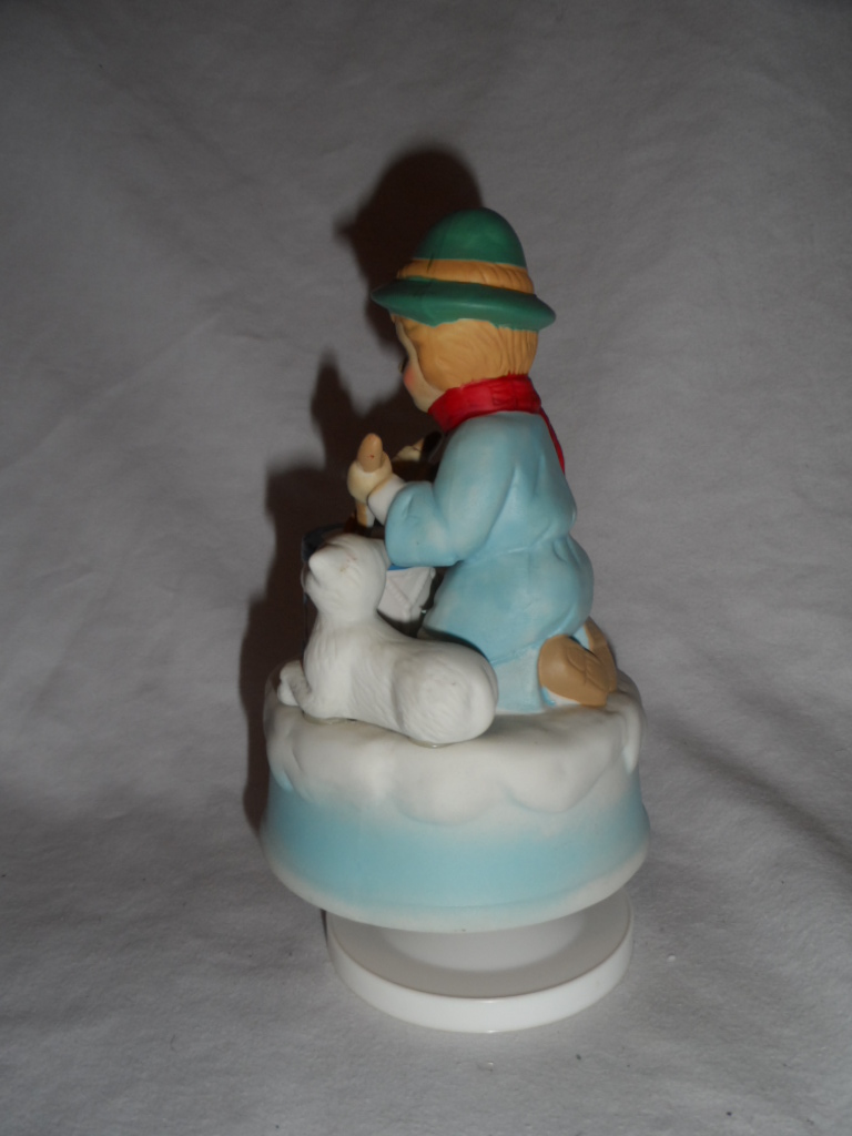 This is pretty much the same item as A 126 009+, same coloring and dimensions approx. But other manufacturer/distributor, right sheep further from and not attached to drum. Music mech. has been clearly replced with newer one and tune therefore not original. On foot, that is original. |