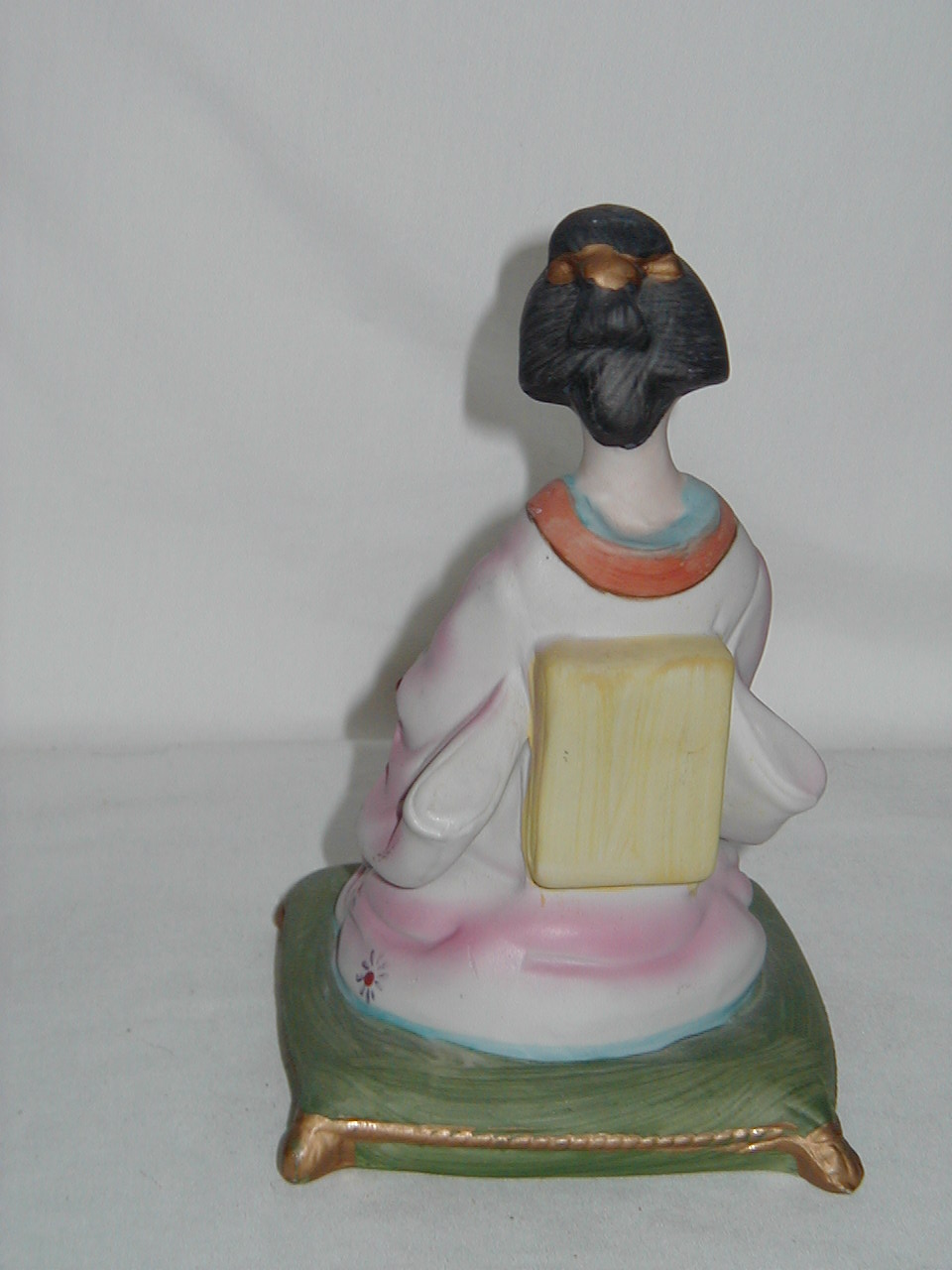 Lady Sitting on Green Cushion with Folded Umbrella |