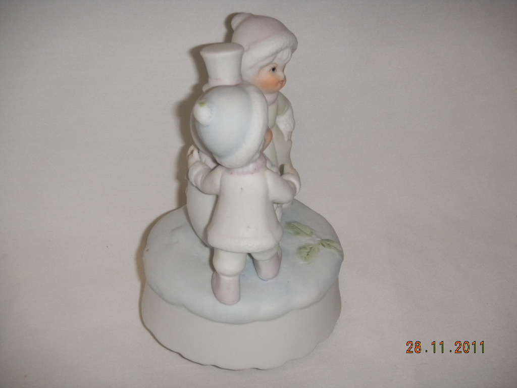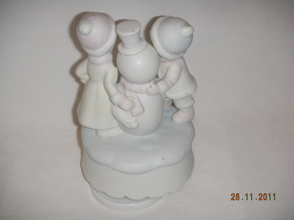 See also A 114 04 ( Meico Snowman with Two Girls); looks like same design but many differences, snowman leaning left or right, girl hand on cane or not, shawl snowman from body or not, other place and smaller/larger holly, other lower rim on base, different weights,etc. |
