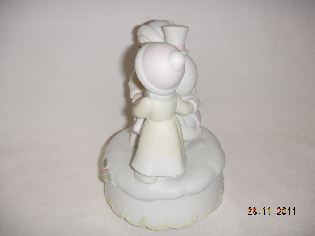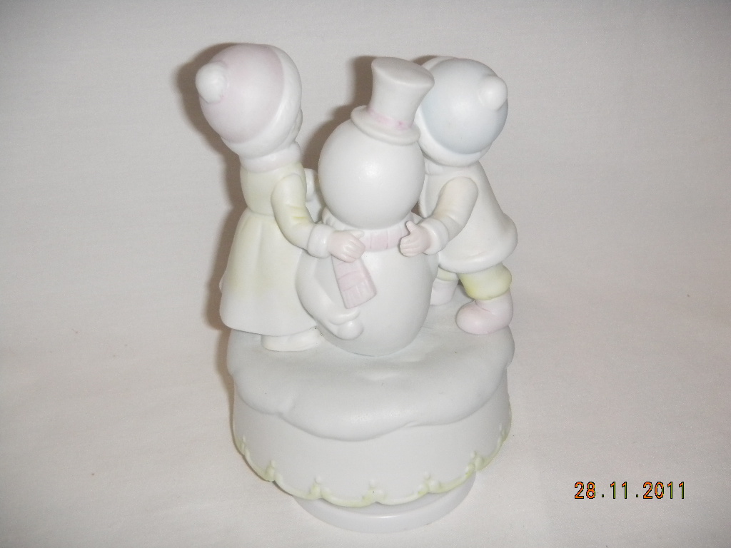 See also A 114 014 (Snowman with Two Girls); looks like same design but many differences, snowman leaning left or right, girl hand on cane or not, shawl snowman from body or not, other place and smaller/larger holly, other lower rim on base, different weights,etc. |