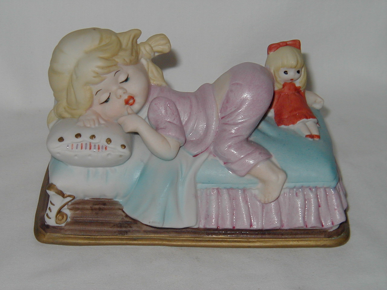 Girl in Pink PJ's Sleeping on Bed with Doll