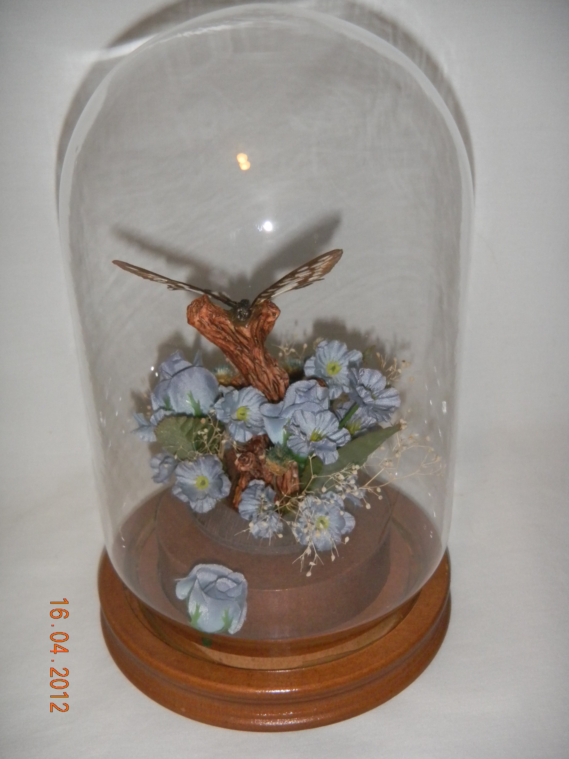 Glass dome, wooden base, silk flowers etc inside.. |