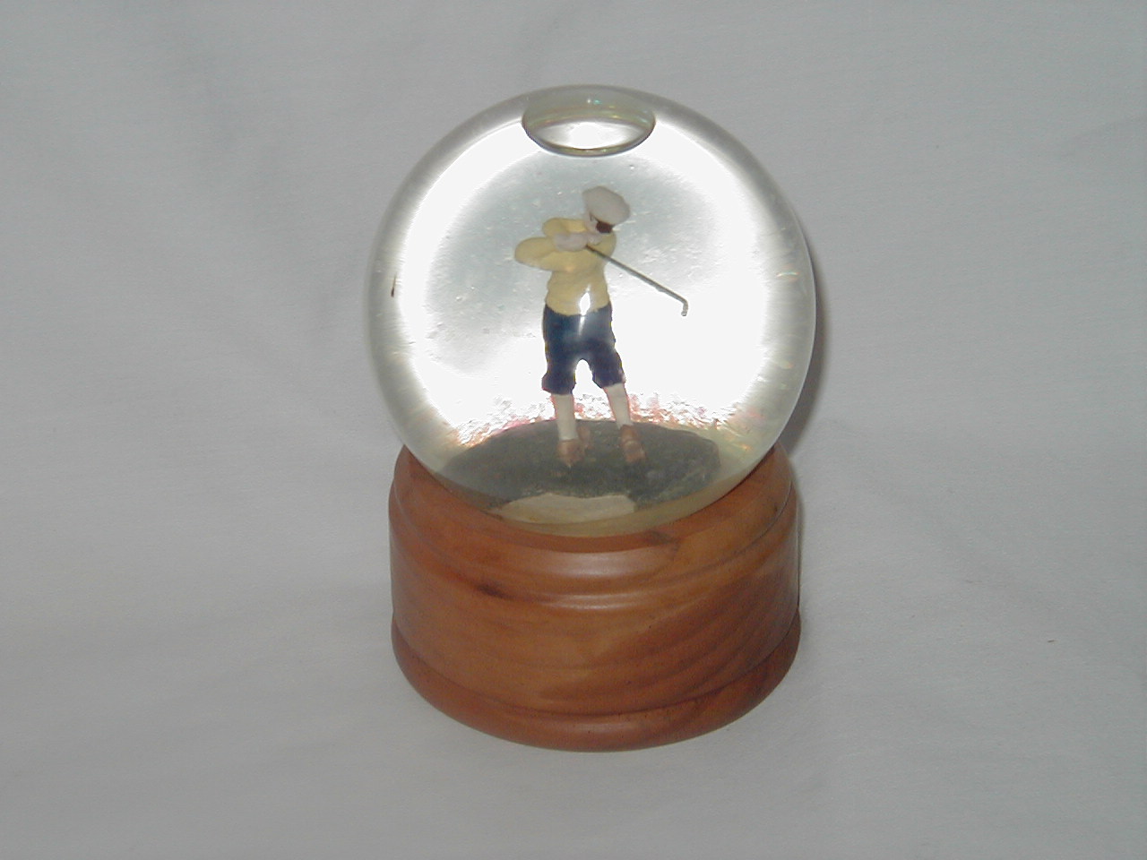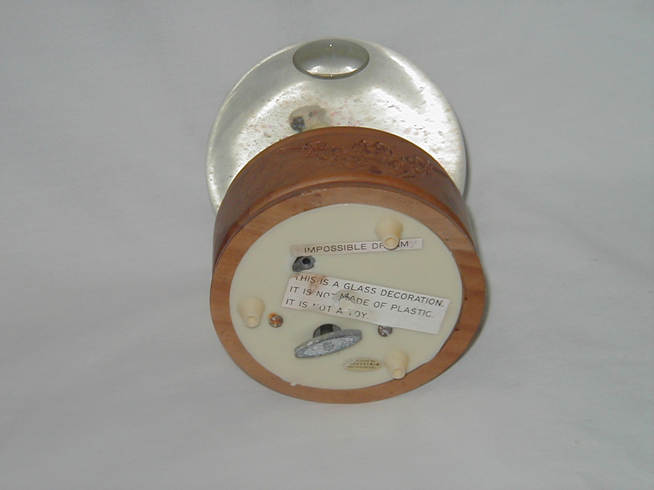 Glitter stuff inside globe somewhat cloudy. Label on bottom: ' This is a Glass Decoration. It is not made of plastic. It is not a toy '. |
