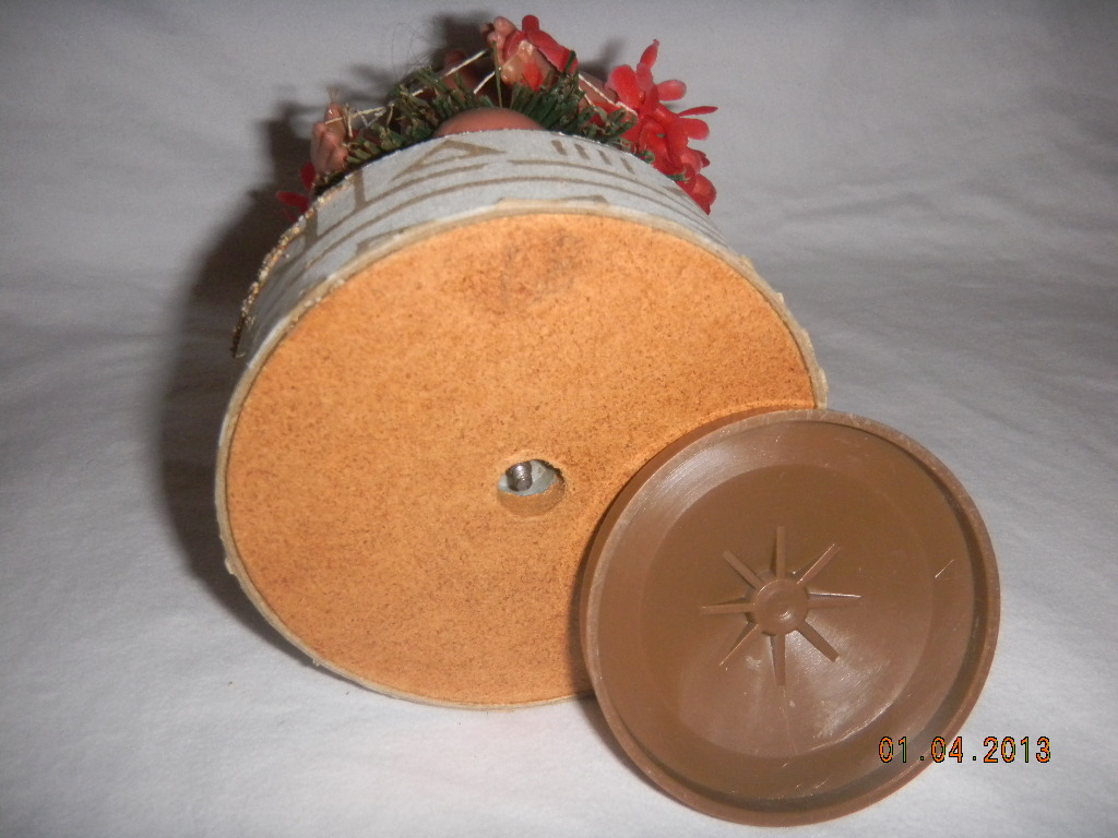 Plastic and wood, cardboard bottom cover. |