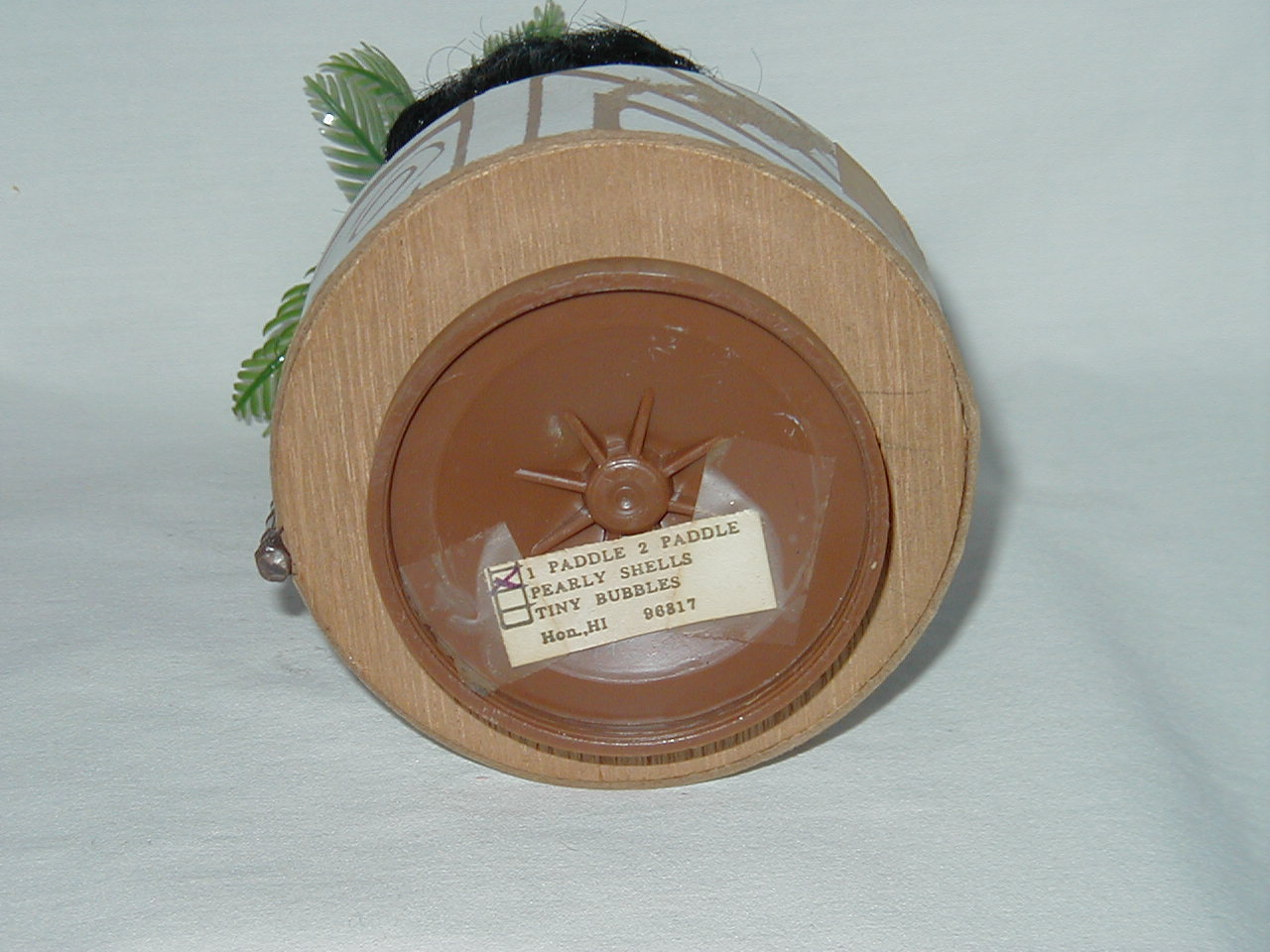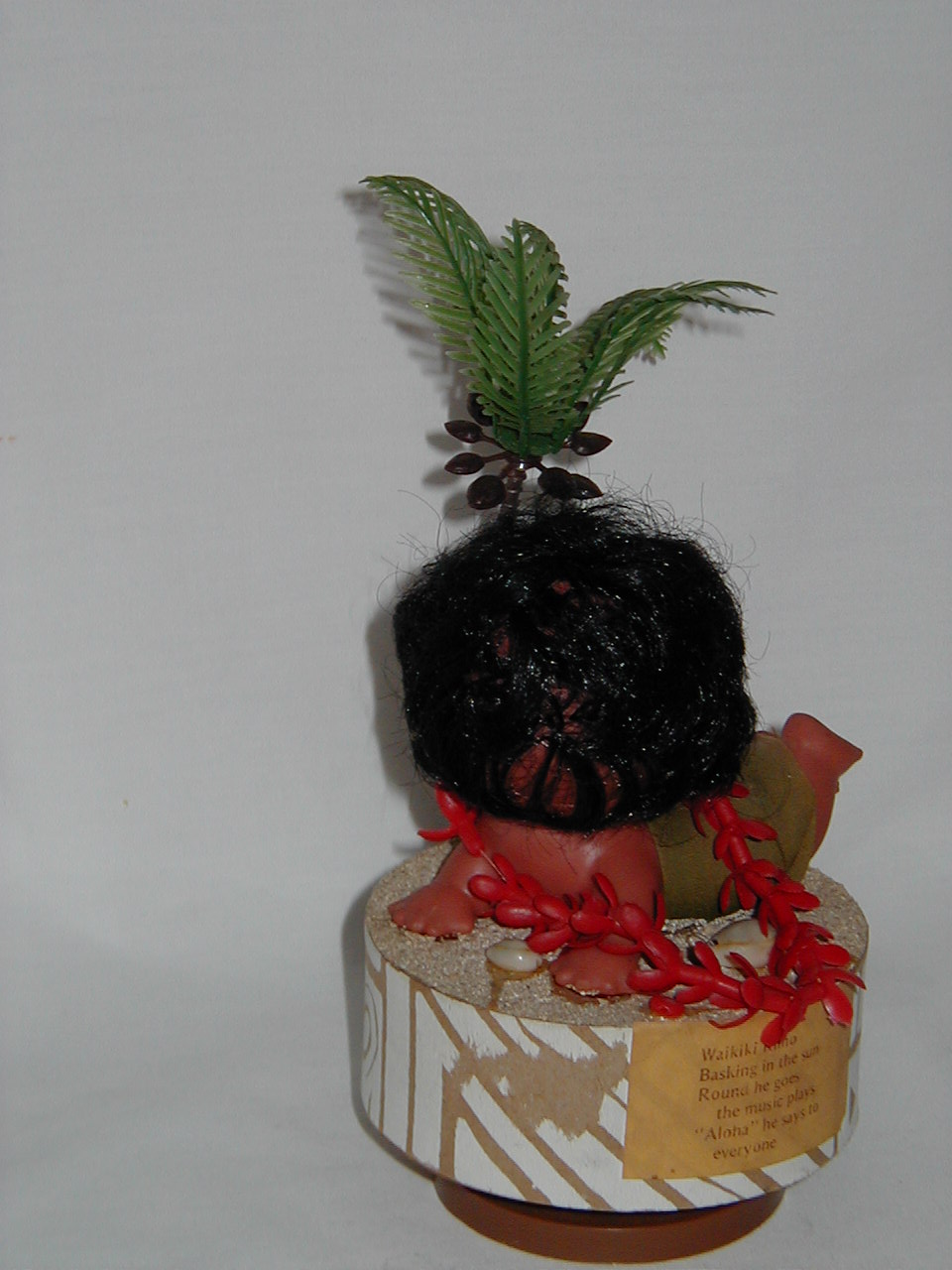 Label on side: 'Waikiki Kimo Basking in the sun Round he goes, the music plays "Aloha" he says to everyone'. And sellotaped label under foot, see photo. |