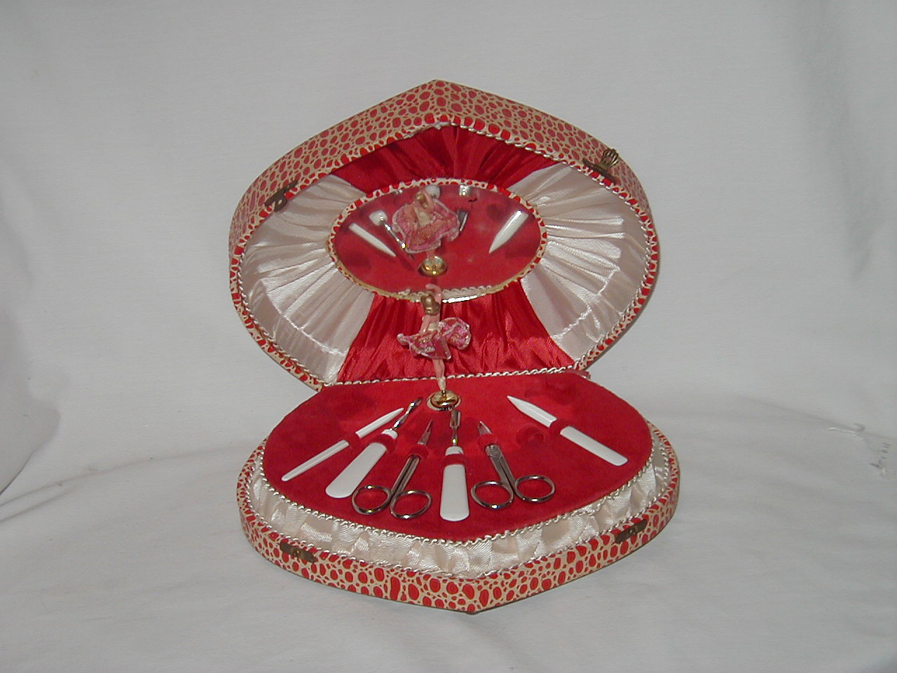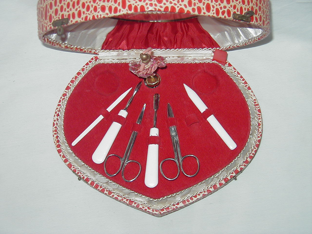 Fair for age, mirror has spot and fogged, manicure set incomplete (one instrument and 2 small tins? missing) and spot on forward point case on croc paper.. |