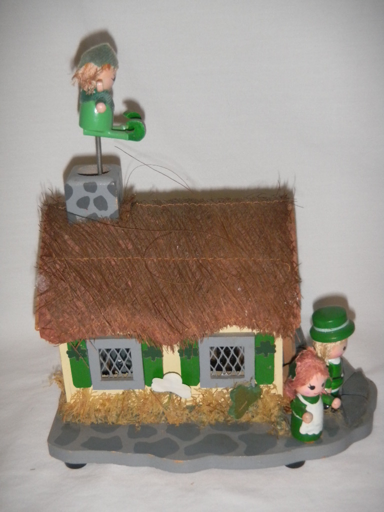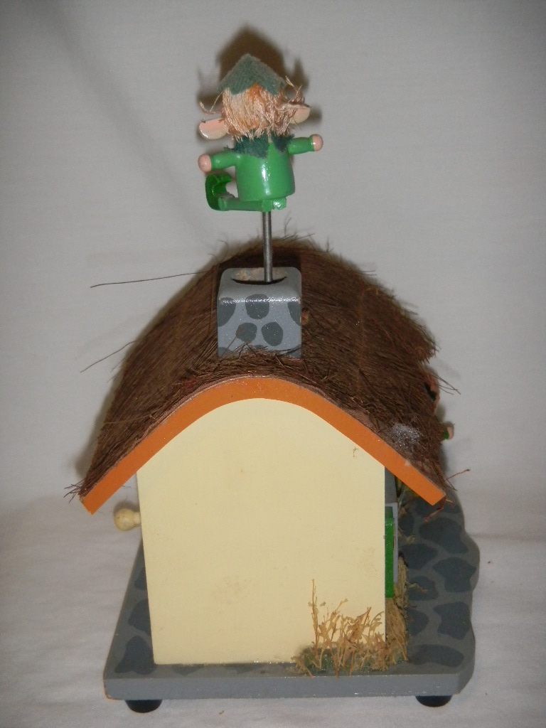 Green man in chimney rotates and comes up and down with music. |
