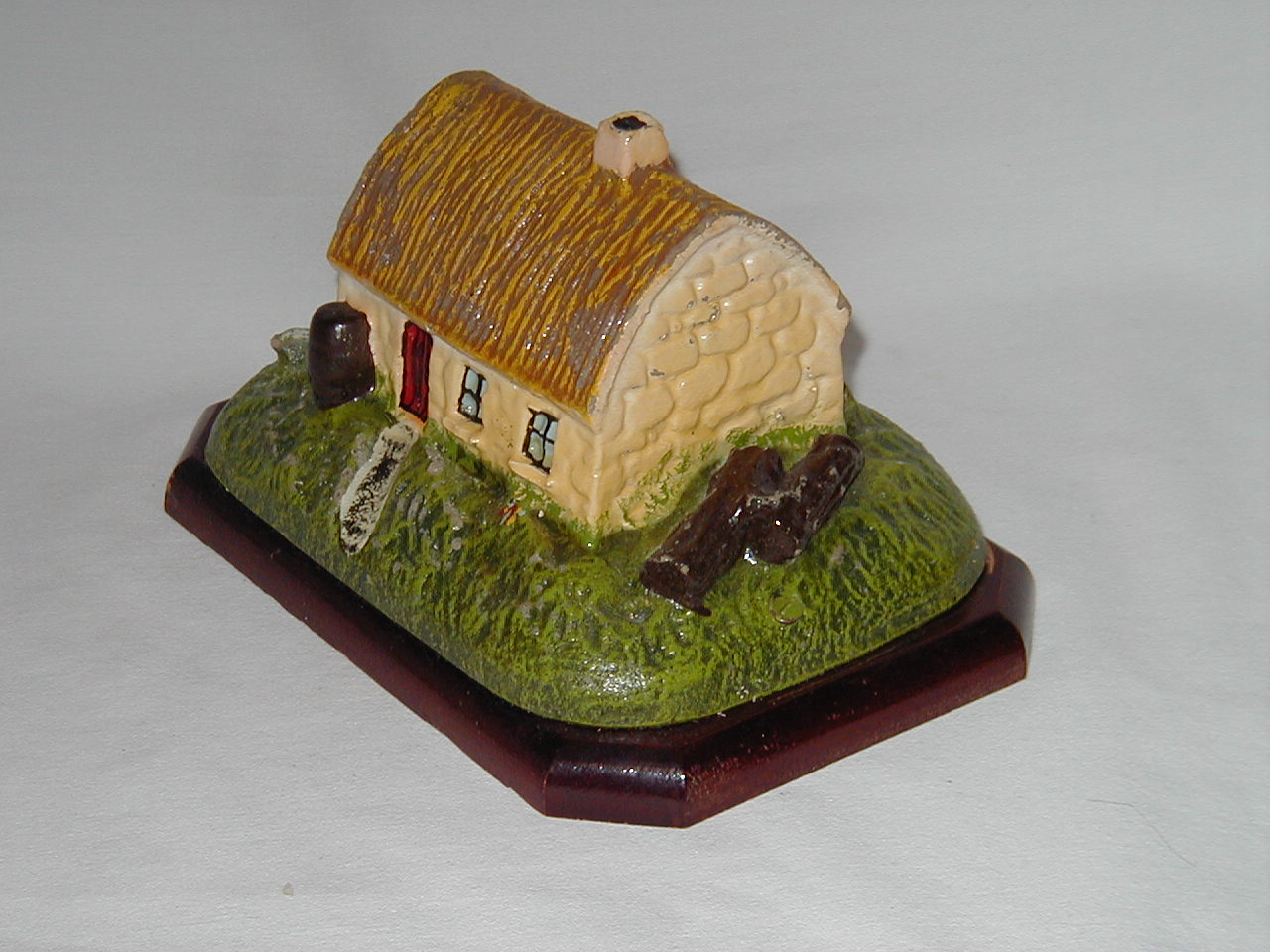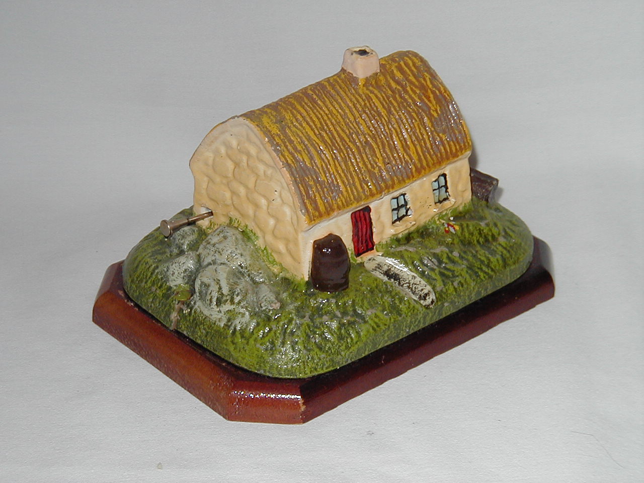 More text on label on bottom: 'Medium Irish Cottage. To bring back fond memories of Ireland, this charming hand-painted model of a traditional Irish thatched cottage. |